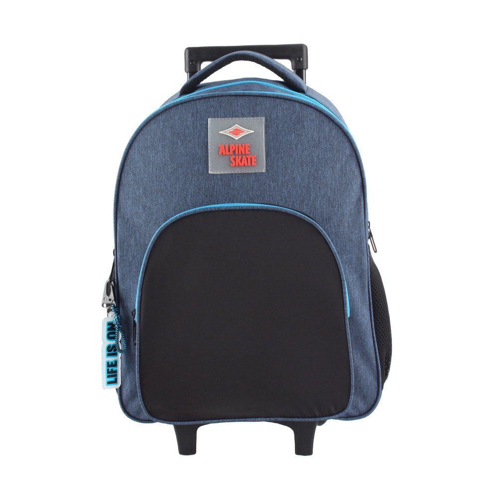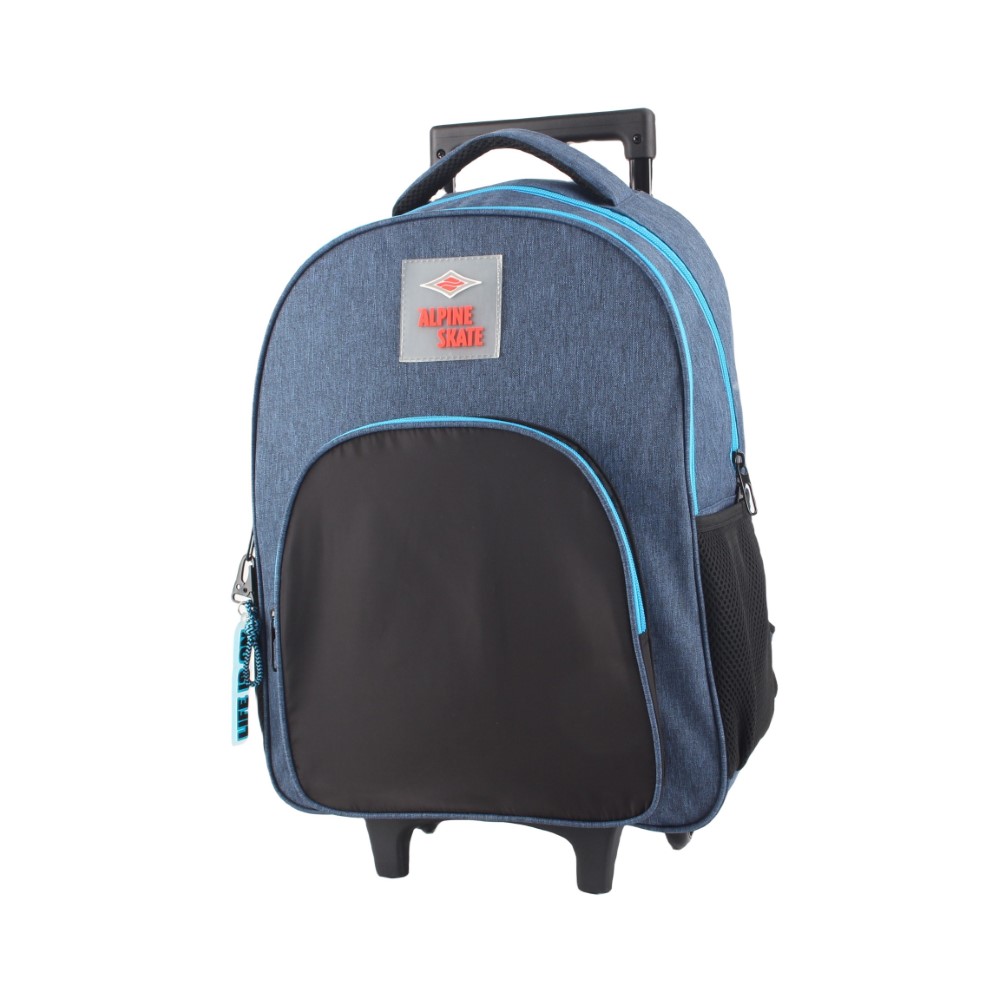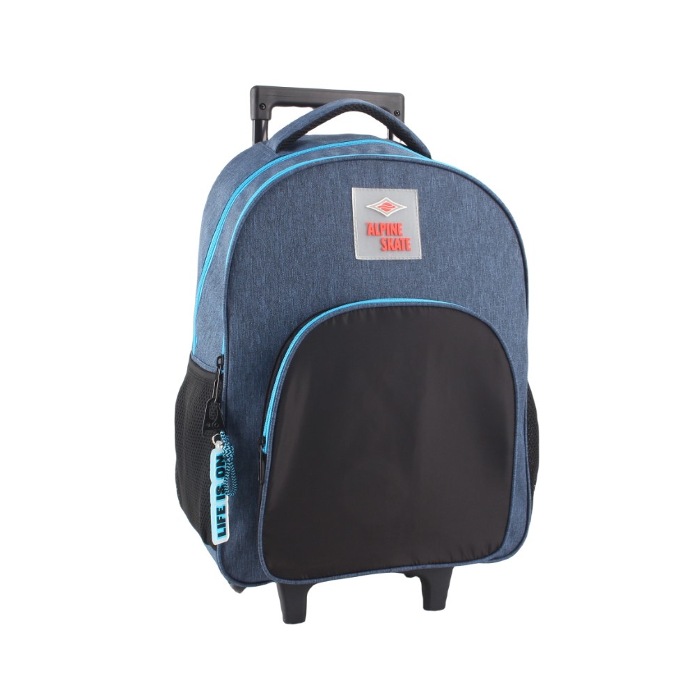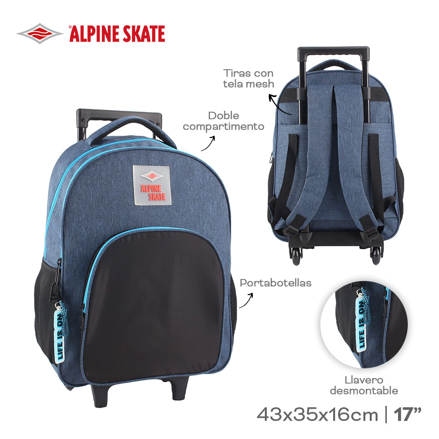 Descripción: · Mochila con carro Extensible. · Amplio compartimiento Principal. · Bolsillo Frontal con Cierre. · Dos Ruedas de Silicona Reforzadas. Diseño Escolar Infantil confeccionado en materiales de primera calidad. Modelo Ultra Liviano y fácil de transportar - Tiras acolchadas para el cuidado los hombros - Confeccionado en Tela reforzada Anti Desgarre ¡Ideal para la escuela, viajes o paseos! Lleva tus cosas protegidas ¡La mochila más Cómoda! · Bolsillos Laterales porta Botella. · Material Reforzado Anti desgarre. · Tiras Acolchadas Air Mesh . · Asa superior Reforzada. · Manija regulable en Altura para usar como Carro. · Base Rígida. · Logo Frontal Alpine Skate. · Interior Forrado. · Incluye Llavero Desmontable .