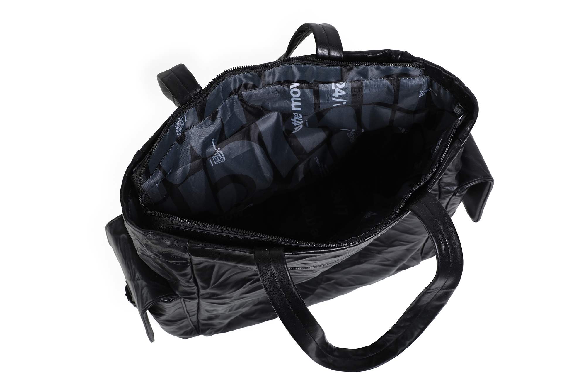 Descripción: ¡Atentos total black fans! Diseñados en un PU negro arrugado muy cool, los productos Barcelona van a convertirse en tus accesorios favoritos de la temporada. Esta tote tiene él tamaño ideal para que lleves todas tus cosas. Además, cuenta con bolsillos laterales de solapa y un cierre en la parte trasera para que guardes el celu o ¡Lo que más te guste! En su interior vas a encontrar una cinta con mosquetón para que tengas las llaves siempre a mano. Además, su detalle de etiquetas y cintas colgantes le dá el toque final que esperabas. Material:PU. Medidas: Ancho en cm: 38. Alto en cm: 40. Pofundidad en cm: 14.5.