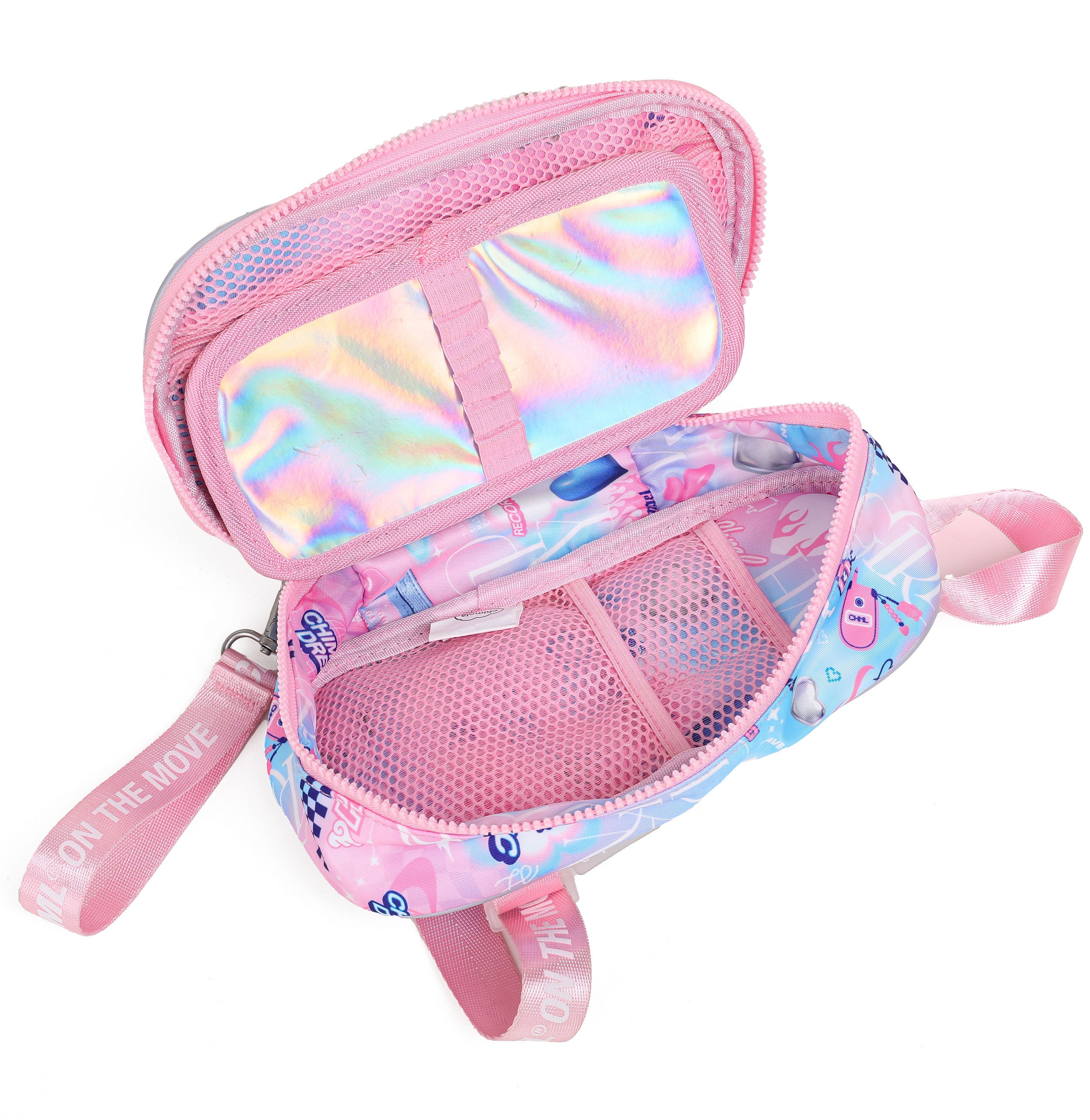 Descripción: ¡Tenemos nuevo formato! Combinando lo mejor del universo Y2K con la esencia vibrante del POP esta cartuchera va a ser tu mejor aliado para llevar todos tus útiles. Además, con una forma de mini-mochila y su correa regulable se transforma en un accesorio súper cool para la vuelta al cole. Sus materiales holográficos, estampas degradé y detalles se combinan a la perfección con su funcionalidad; Este modelo cuenta con un compartimiento grande lleno de bolsillos y organizadores internos, para que tengas siempre todo la vista. ¿Qué estás esperando? Encontrala también en su color Light Purple. Medidas: Ancho: 12.5cm. Alto: 24cm. Profundidad: 8cm.