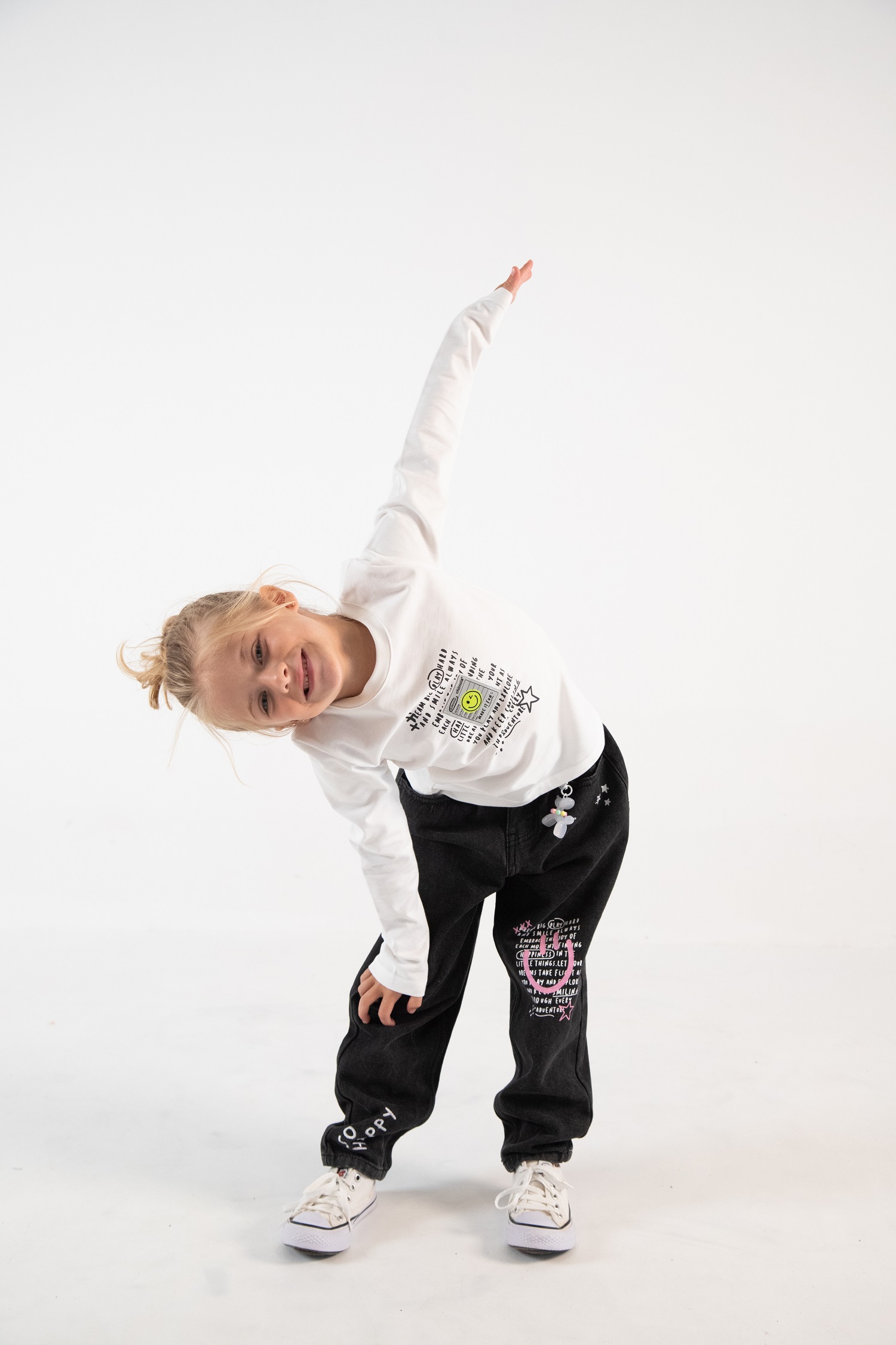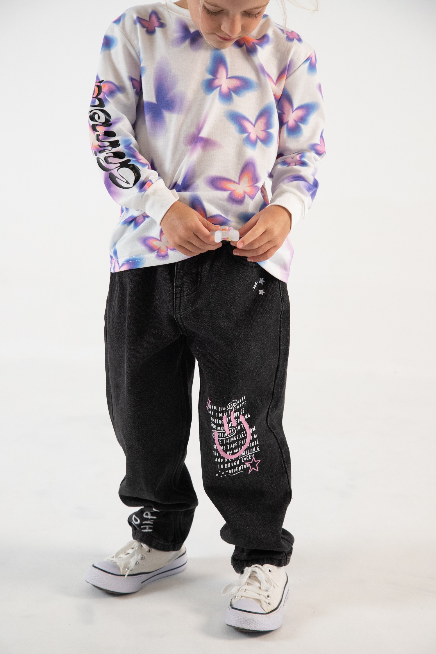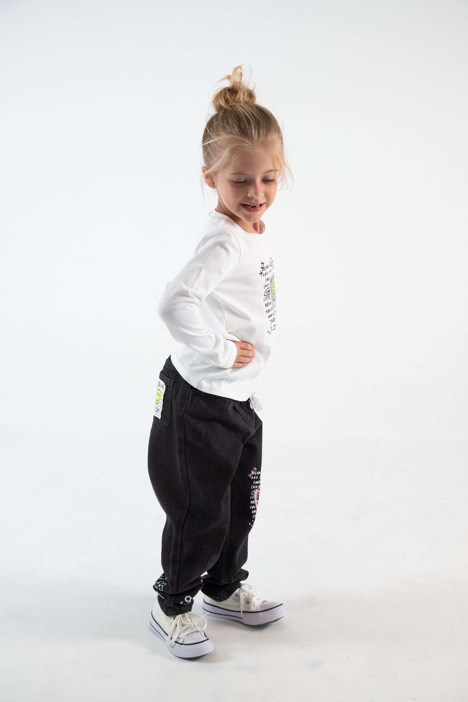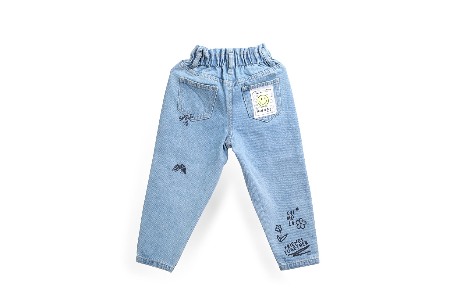 Descripción: Pantalón "Mom Hope" con diseño estampado en su parte delantera y trasera. Este denim para niñxs cuenta con un tierno aplique colgante desmontable de perrito globo. Composición 75% algodón, 5% fibra viscosa y 20% polyester. Disponible en negro y light blue. TABLA DE TALLE: A) Largo Total, B) Ancho de Cintura Relajada, C) Ancho de Cintura Estirada , D) Ancho de Cadera. *T4: A) 60, B) 19, C) 32, D) 35,5 *T6: A) 68, B) 22, C)35, D) 38,5 *T8: A) 76, B) 24, C) 37, D) 40,5 *T10: A) 84, B) 26, C)39, D) 42,5 *T12: A) 92, B) 28, C)41, D) 44,5