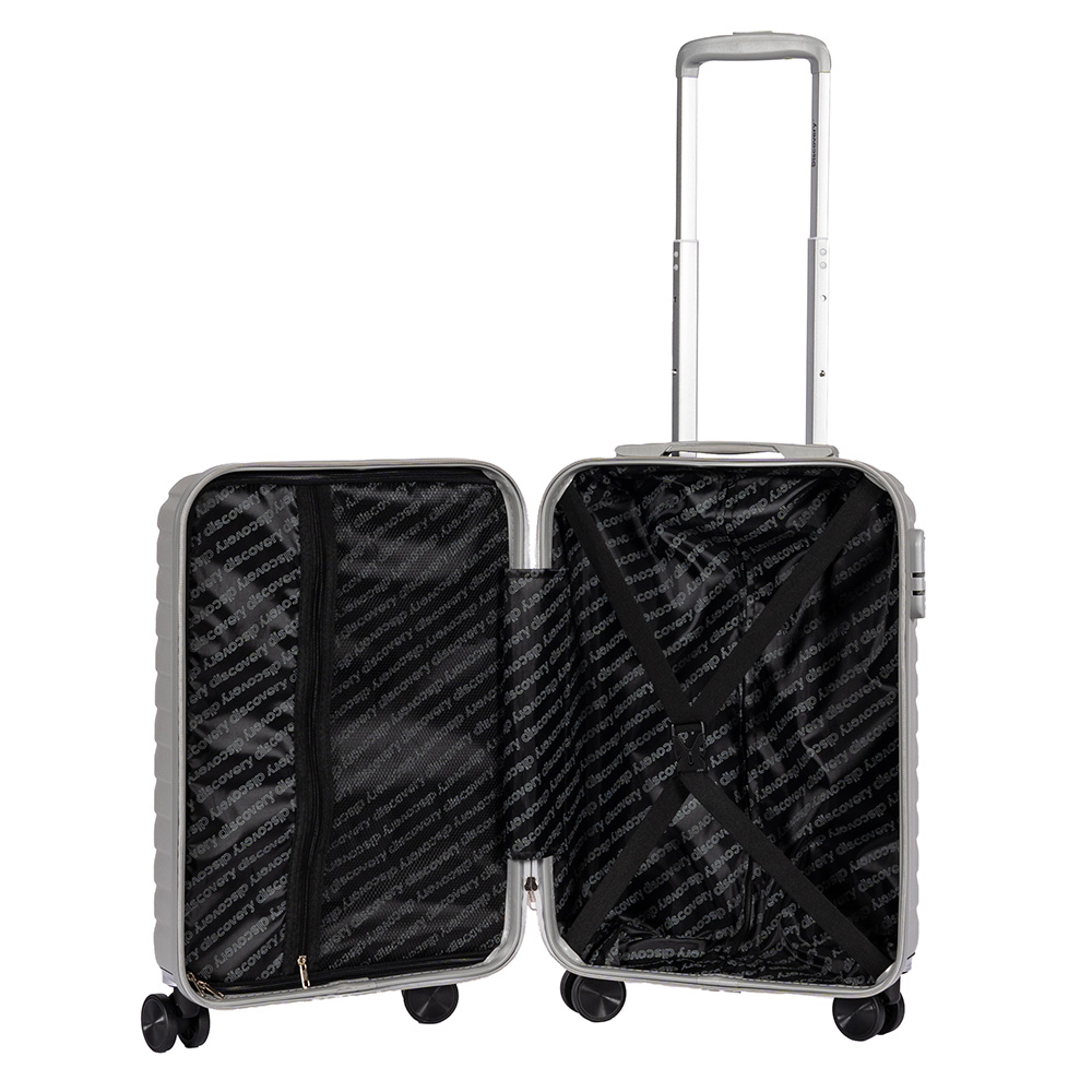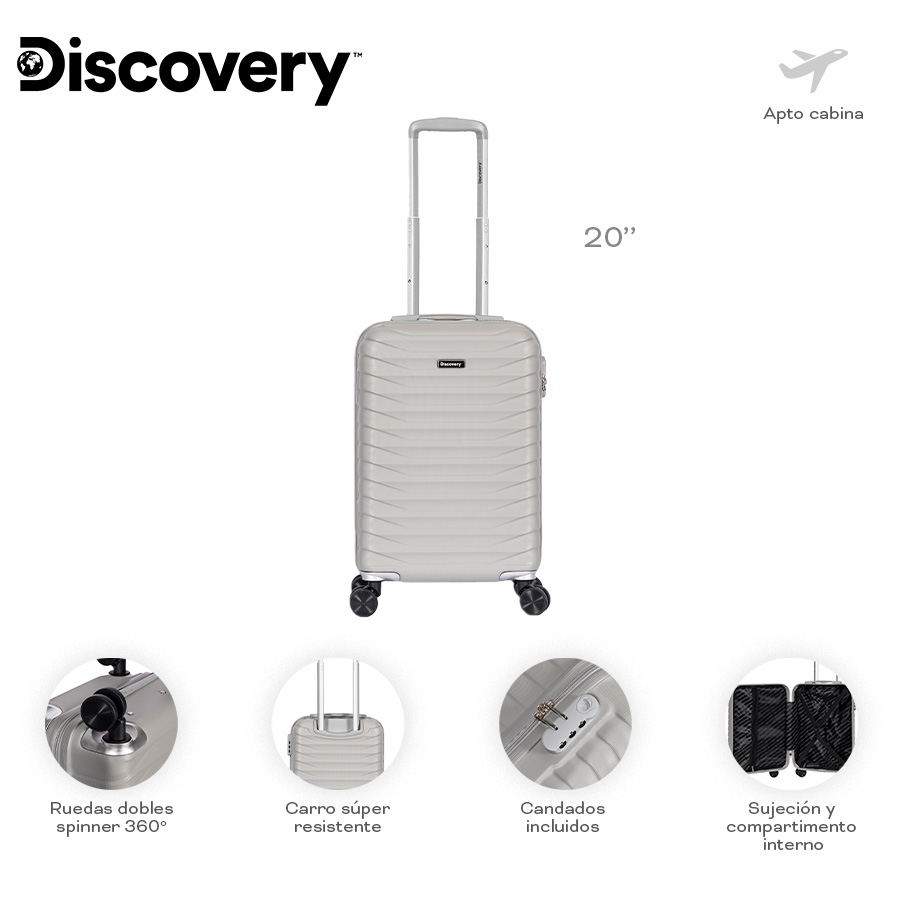 Descripción: · Amplio compartimiento principal. · Candado Incorporado con clave numérica de 3 dígitos. · Elásticos de sujeción interna. · 4 ruedas dobles giratorias 360° reforzadas. Valija Rígida Discovery con 4 ruedas dobles Giratorias que hacen más práctico el Viaje - Las maletas más resistentes y ligeras de todas - Ideal para tus viajes y paseos. Lleva todas tus cosas seguras ¡Protege los objetos más frágiles! Diseño elegante - Diseño Irrompible, elegante y ejecutivo para que viajes de la manera más cómoda. · Valija liviana confeccionada en 100% ABS + Metal. · Livianas y cómodas para viajar. · Sistema spinner 360º. · Manija regulable en altura. · Asa superior para mejor traslado. · Interior forrado con logo de la marca. · Cierres reforzados. · Zippers metálicos. · División interna con cierre que permite tener todo organizado. · Cintas de ajustes y amarre. · Medidas: Altura 46cm + 5cm Ruedas x Ancho: 33cm x Profundidad: 22cm