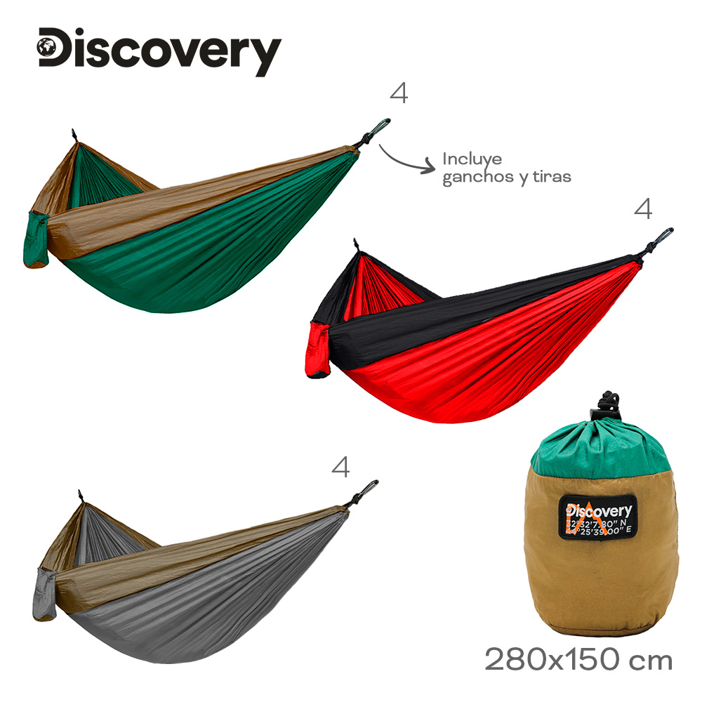 Descripción: · Fabricada en 100% Nylon. · Peso máximo soportado: 130kg aprox. · Dos mosquetones de alta resistencia para anclaje seguro. · Dos correas de hamaca, fáciles de ajustar y colocar. · Material ligero de alta resistencia. · Diseño portátil. · Ventilación óptima. · Incluye bolsa de traslado compacta y liviana. · Medida: Largo 280 cm x Ancho 150 cm. HAMACA PARAGUAYA CON GANCHOS Y TIRAS DISCOVERY. La Hamaca Discovery es la opción ideal para quienes buscan comodidad y practicidad en sus viajes, campamentos y actividades al aire libre. Fabricada en 100% nylon, es resistente, transpirable y fácil de transportar gracias a su bolsa compacta. Su diseño permite una instalación rápida y segura en cualquier entorno.