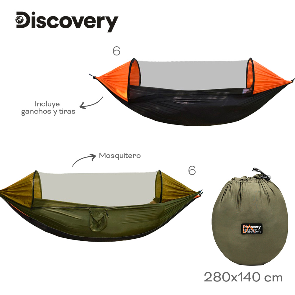 Descripción: · Fabricada en Nylon ultrarresistente. · Incluye mosquitero. · Con bolso de traslado. · Dos mosquetones para una sujeción segura. · Una cuerda elástica para mayor estabilidad. · Dos correas de hamaca para montaje fácil en diferentes superficies. · Bolsa de transporte compacta para un guardado cómodo y eficiente. · Liviana y fácil de transportar. · Protección contra insectos gracias al mosquitero integrado. · Montaje rápido y seguro con correas ajustables. · Ideal para camping, trekking, playa y actividades al aire libre. · Diseño ergonómico que permite una experiencia de descanso óptima. · Medidas: Largo 280cm x Ancho 140cm. La Hamaca Discovery con mosquitero es la solución ideal para quienes disfrutan de la naturaleza sin renunciar al confort y la protección. Diseñada para ofrecer una experiencia de descanso óptima en cualquier entorno, su estructura liviana y resistente facilita el montaje y la portabilidad.
