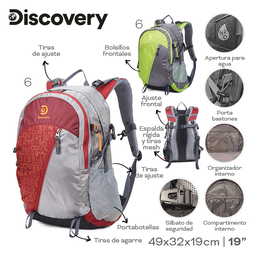 Descripción: Info: 19p, Silbato, Tiras de ajuste, Esp. rígida c/tela mesh, Salida H2O, Portabastones, Bolsillos Composición: Nylon Alto: 49cm Ancho: 32cm Profundidad: 19cm
