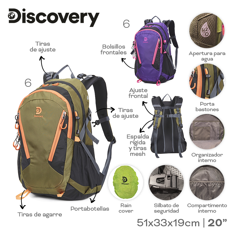Descripción: Info: Silbato, Tiras de ajuste, Rain cover, Esp. rígida c/tela mesh, Salida H2O, Portabastones, Bolsillos Composición: Nylon Alto: 51cm Ancho: 33cm Profundidad: 19cm