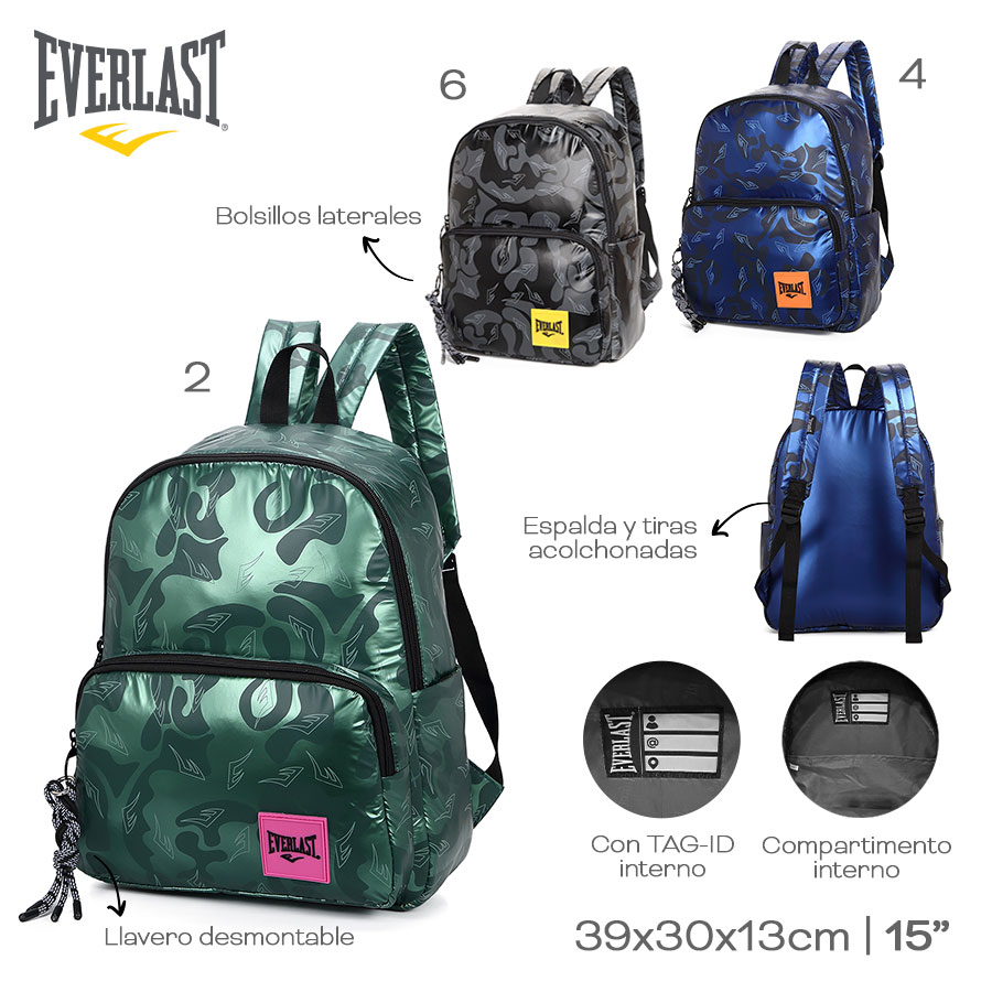 Descripción: 1 división principal. -Compartimento interno. -Bolsillo frontal. -Bolsillos laterales. -Espalda y tiras de espalda acolchadas. -Logo de la marca en el frente. -Llavero desmontable. -Con TAG-ID interno. -Material: nylon efecto metalizado. -Medidas aproximadas: Alto 39 cm, x ancho 30 cm, x profundidad 13 cm.