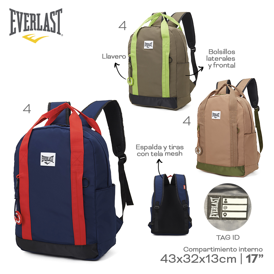 Descripción: Características: - Una división Interior forrado Bolsillo interno de tipo abierto Bolsillo abierto en cada lateral Dorso y tiras con Air Mesh - Doble manija superior de transporte de 43 cm cada una Tiras extensibles hasta 78 cm cada una Material: poliéster Medidas aproximadas: alto 43 cm, x ancho 32 cm, x profundidad 13 cm -