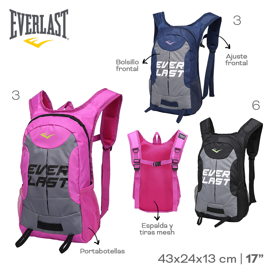 Descripción: · Amplio compartimiento principal. · Confeccionada en Nylon. · Bolsillos laterales de red. Modelo Ultra Liviano y fácil de transportar - Espalda y tiras Acolchadas Air Mesh, para el cuidado de tus hombros y espalda - Ajuste Frontal ¡Ideal para tus viajes o paseos! Liviana para correr y llevar artículos indispensables. · Mochila Running Everlast. · Salida para bolsa de hidratación. · Tiras y espalda acolchadas Air Mesh. · Asa superior reforzada. · Semi-Impermeable. · Cierres doble abertura. · Con cincha de ajuste abdominal. · Medidas: Alto 43cm x Ancho 24cm x Prof, 13cm.