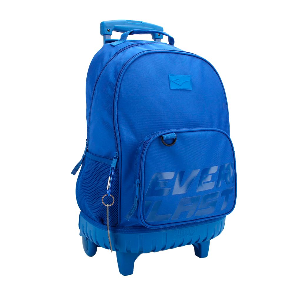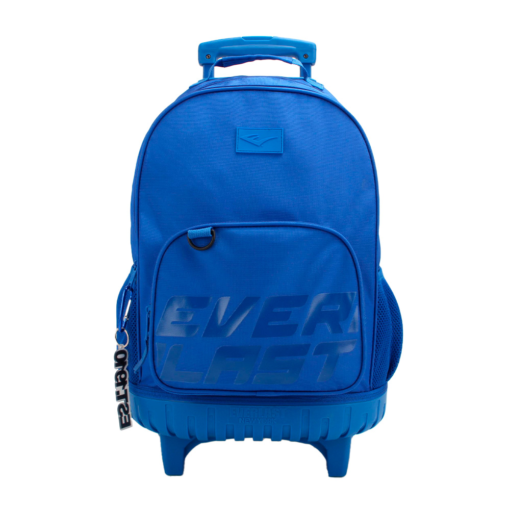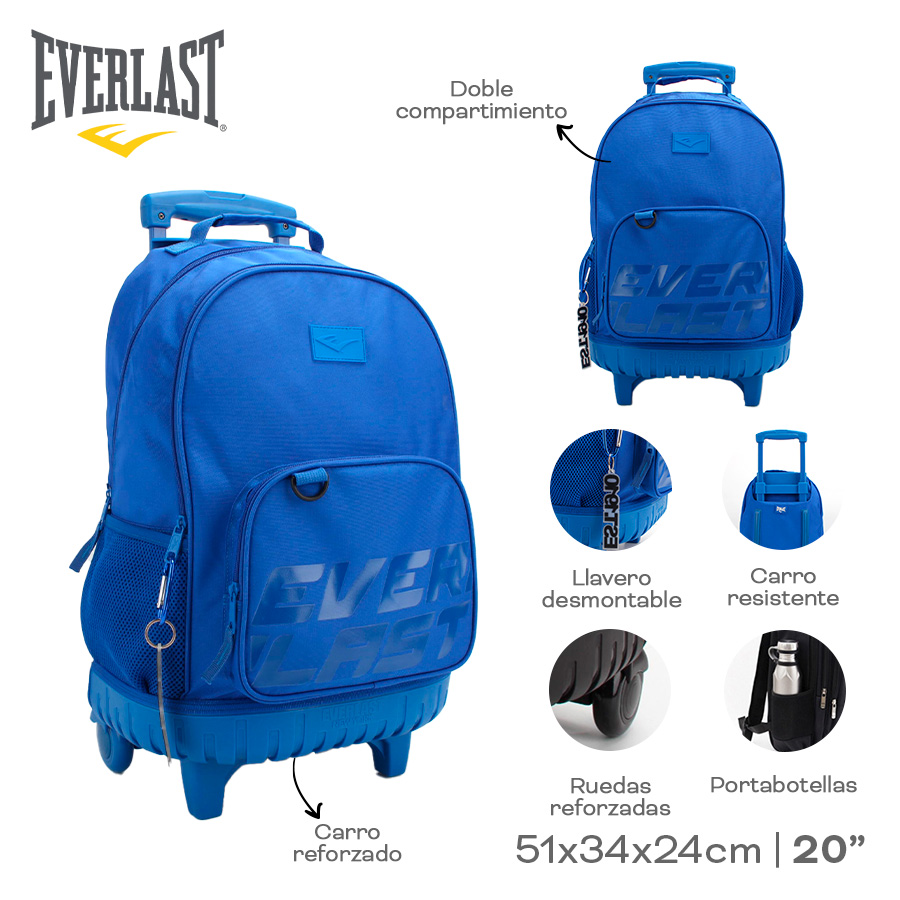 Descripción: MOCHILA CARRO EVERLAST INFANTIL ESCOLAR + LLAVERO. · Doble compartimiento principal. · Incluye llavero desmontable. · Confeccionado en Poliéster. · Dos ruedas de silicona reforzadas. Diseño Escolar Infantil confeccionado en materiales de primera calidad. Modelo Ultra Liviano y fácil de transportar - Tiras acolchadas para el cuidado los hombros - Confeccionado en Tela reforzada Anti Desgarre ¡Ideal para la escuela, viajes o paseos! Lleva tus cosas protegidas ¡La mochila más Cómoda!. · Mochila Carro Everlast. · Bolsillo frontal con cierre. · Bolsillos Laterales de red porta botella. · Material reforzado anti desgarre. · Asa superior reforzada. · Manija regulable en altura para usar como carro. · Base rígida. · Logo Frontal Everlast. · Interior forrado. · Cierres reforzados. · Medidas: Ancho 51cm x Alto 34cm x Profundidad 24cm.