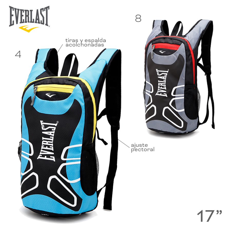 Descripción: Amplio compartimiento Principal. · Bolsillo Frontal con Cierre. · Tiras y espalda acolchadas Air Mesh. · Bolsillos Laterales de Red. Modelo Ultra Liviano y fácil de transportar - Espalda y tiras Acolchadas Air Mesh, para el cuidado de tus hombros - Ajuste Pectoral ¡Ideal para tu deporte favorito, viajes o paseos! Diseño Aerodinámico y material Absorbente - Liviana para correr y llevar artículos indispensables. · Confeccionado en Tela Anti desgarre. · Asa Reforzada. · Sistema Molle. · Cierres deportivos doble Abertura. · Con cincha de ajuste Pectoral. · Sistema Air Fluid · Tiras Regulables. · Logo Frontal Everlast. · Medidas 40 x 22 x 17 cm.