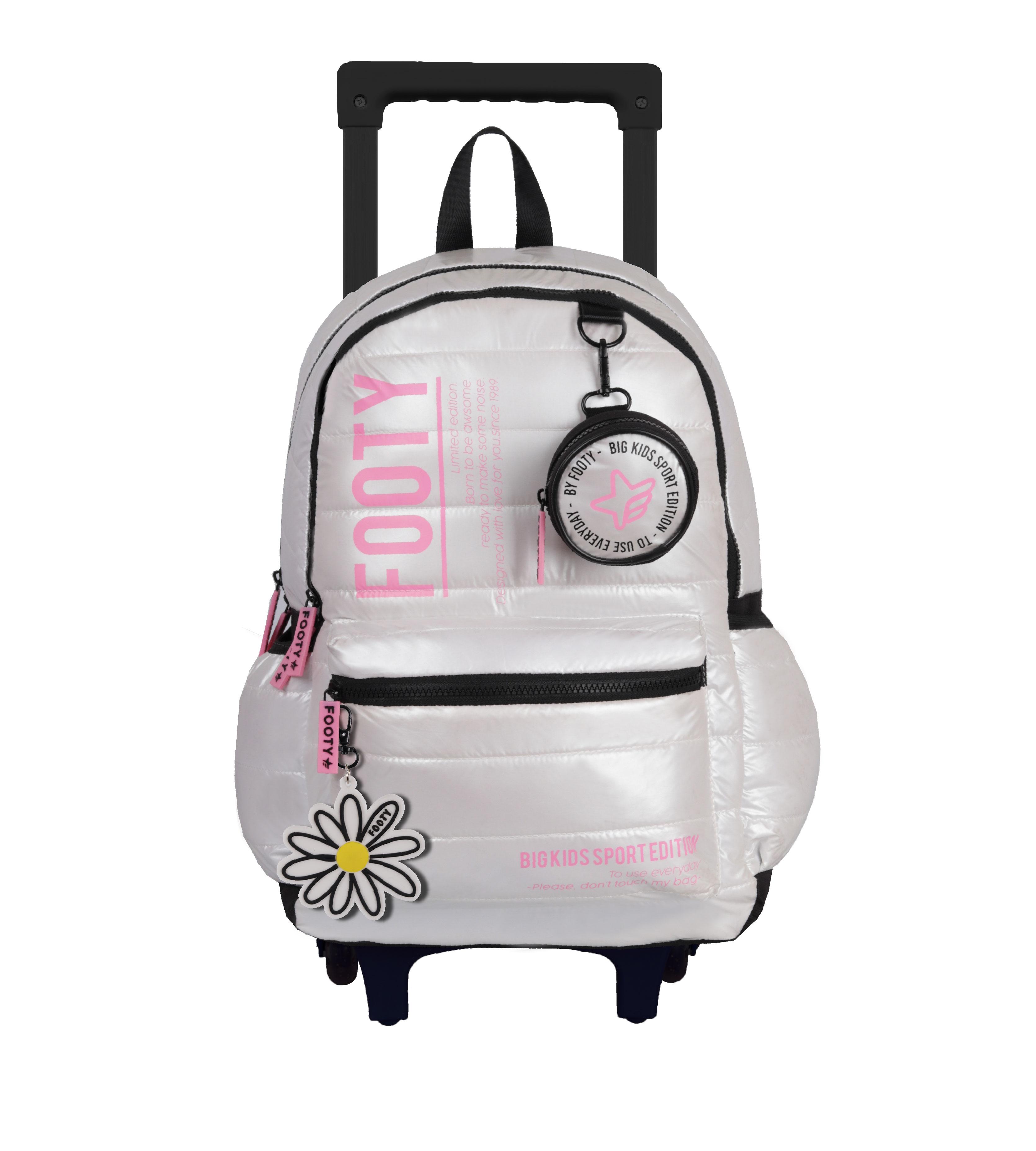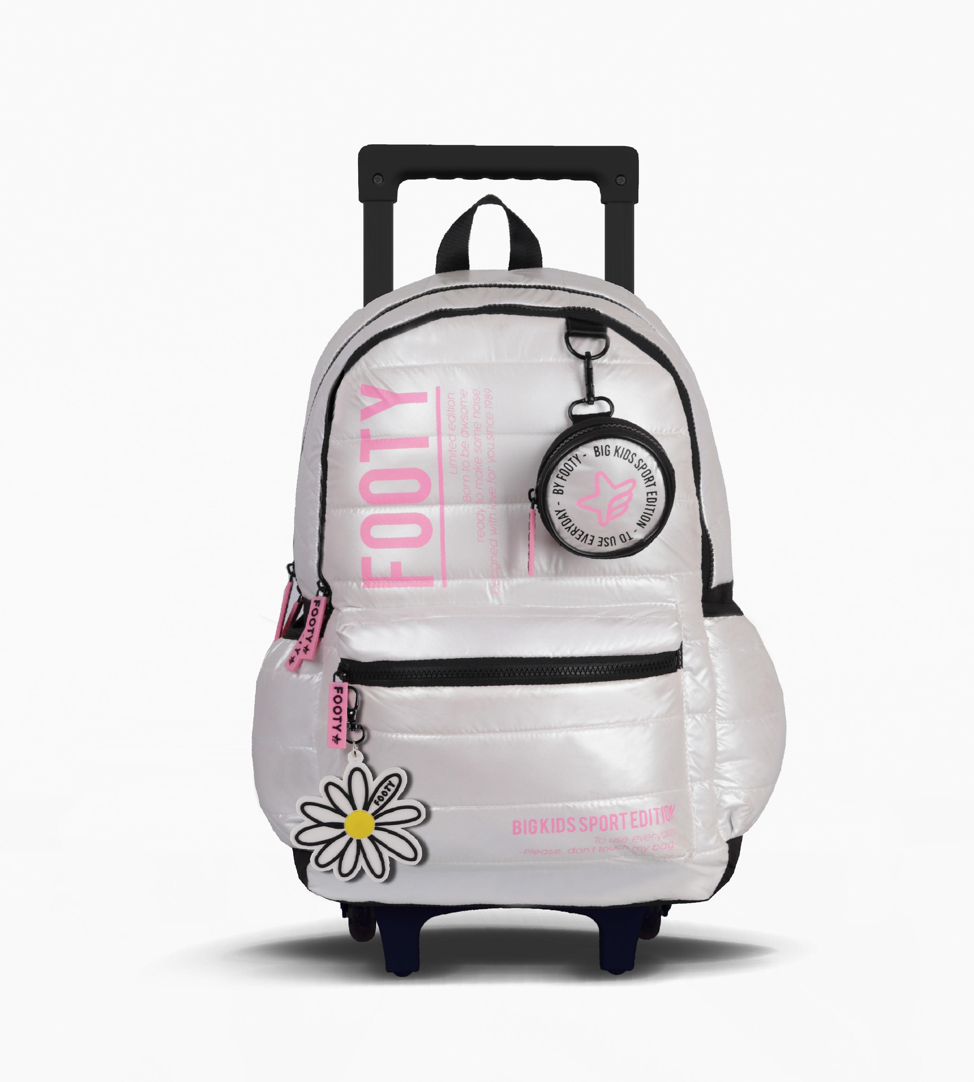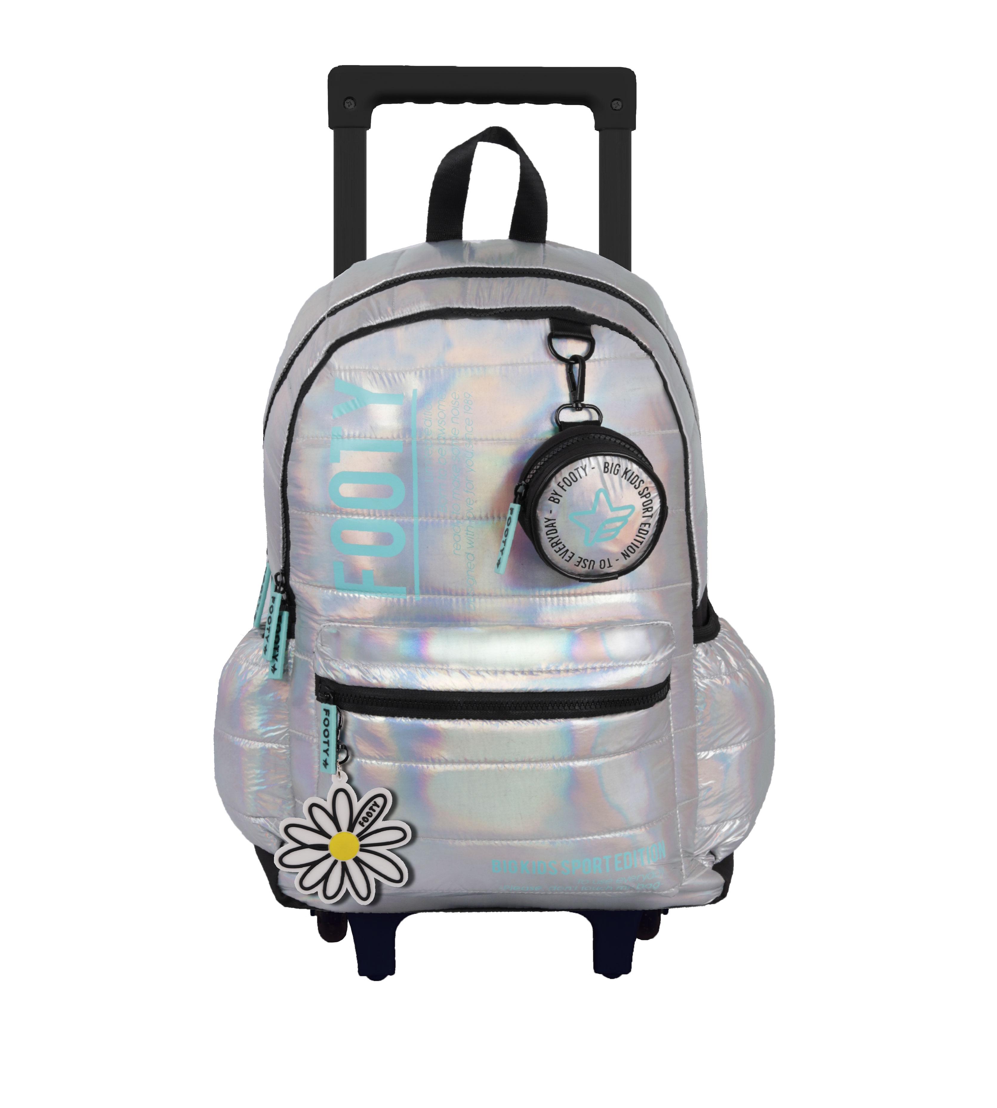 Descripción: MOCHILA CARRO 18P 2 COMPARTIMENTOS CON CIERRE 1 BOLSILLO FRONTAL 1 BOLSILLO LATERAL BOLSILLO INTERNO PARA NOTEBOOK TELA MATELASEADA CON ESTAMPA LLAVERO DE RUBBER CON FORMA DE MARGARITA Y APLIQUES DE MARGARITA CON VELCRO PARA DECORAR LAS TIRAS. TIRAS REFORZADAS Y MANIJA DE AGARRE.