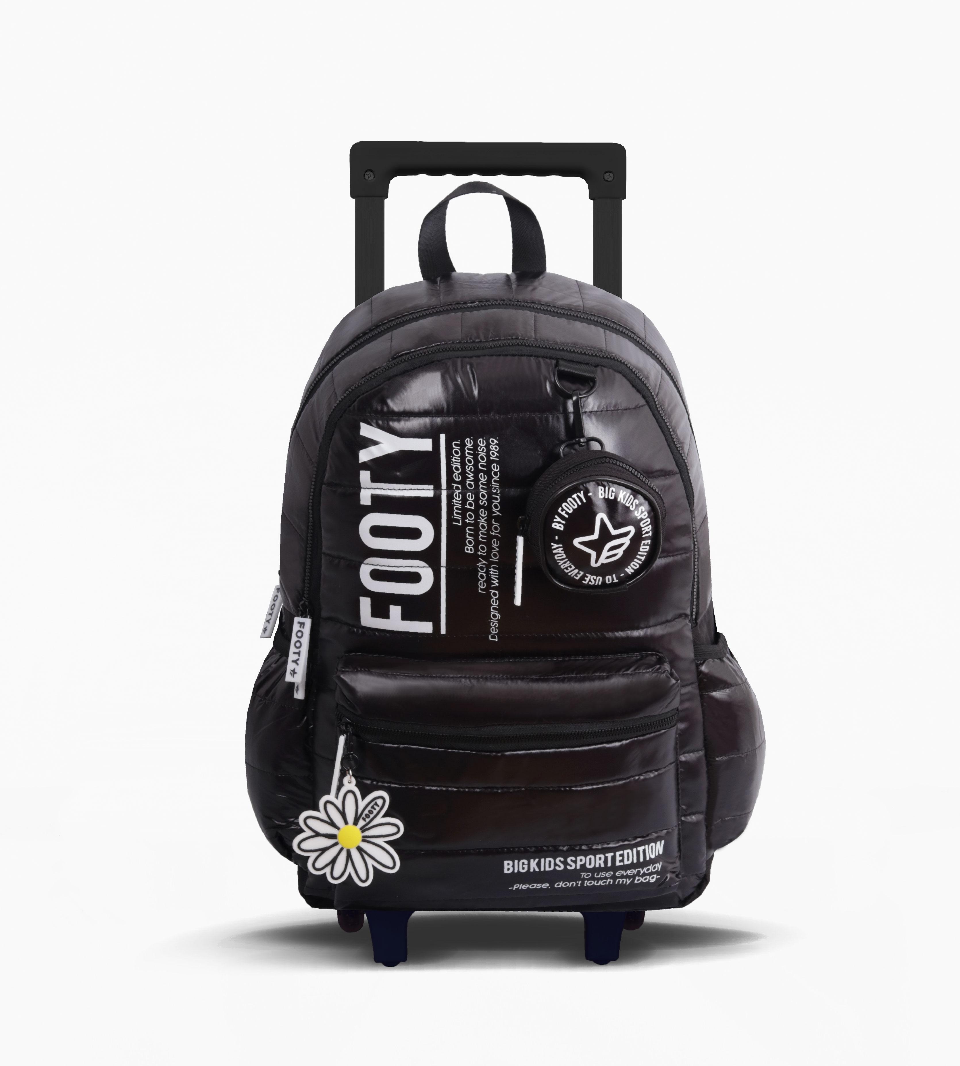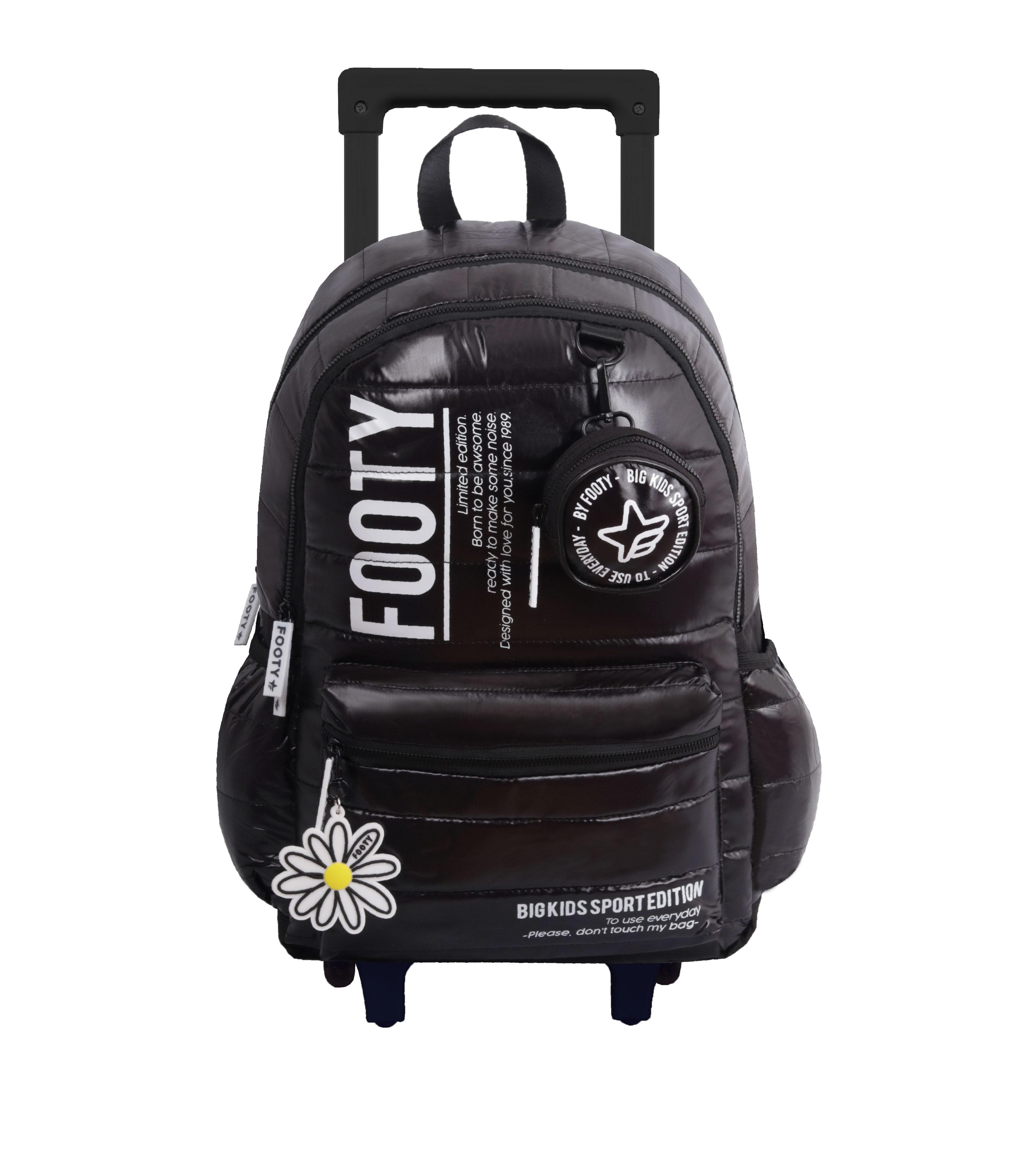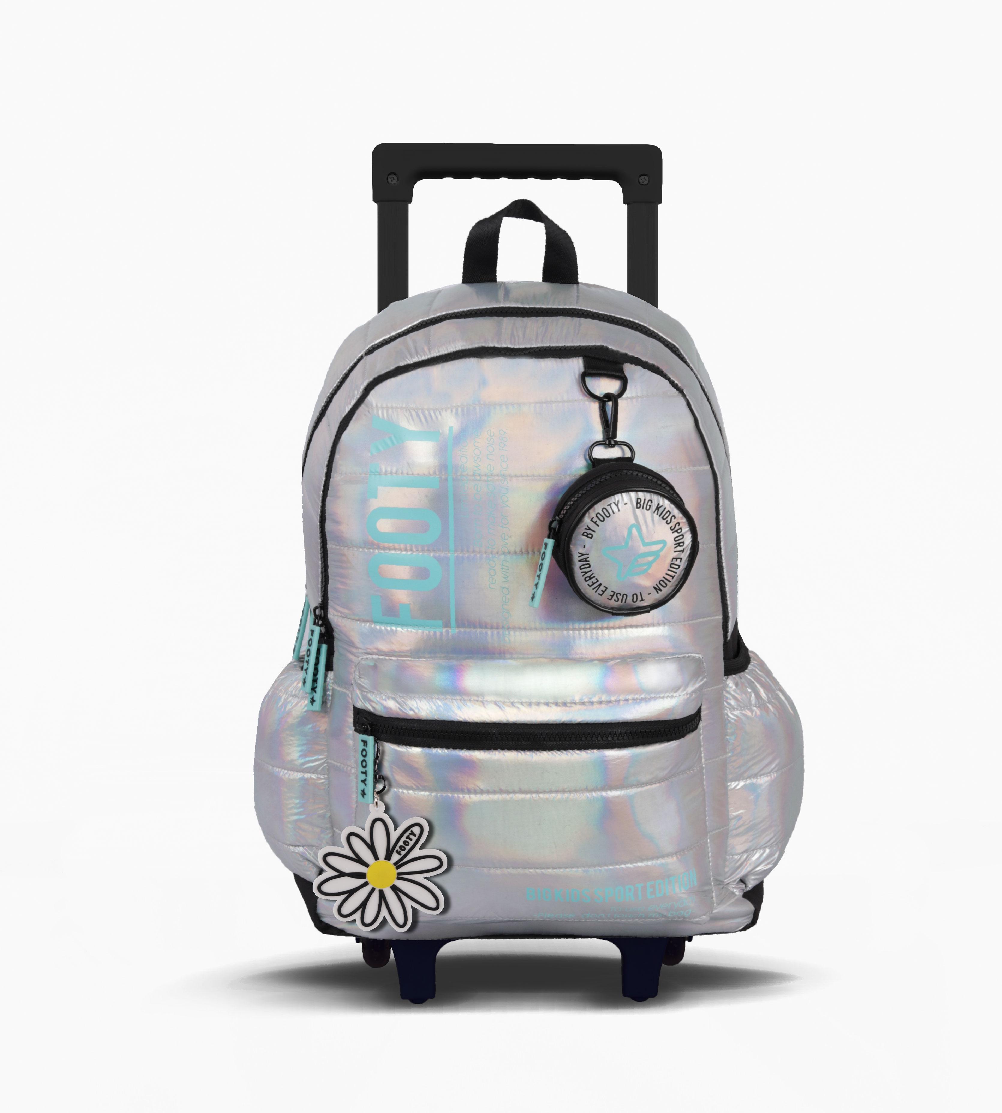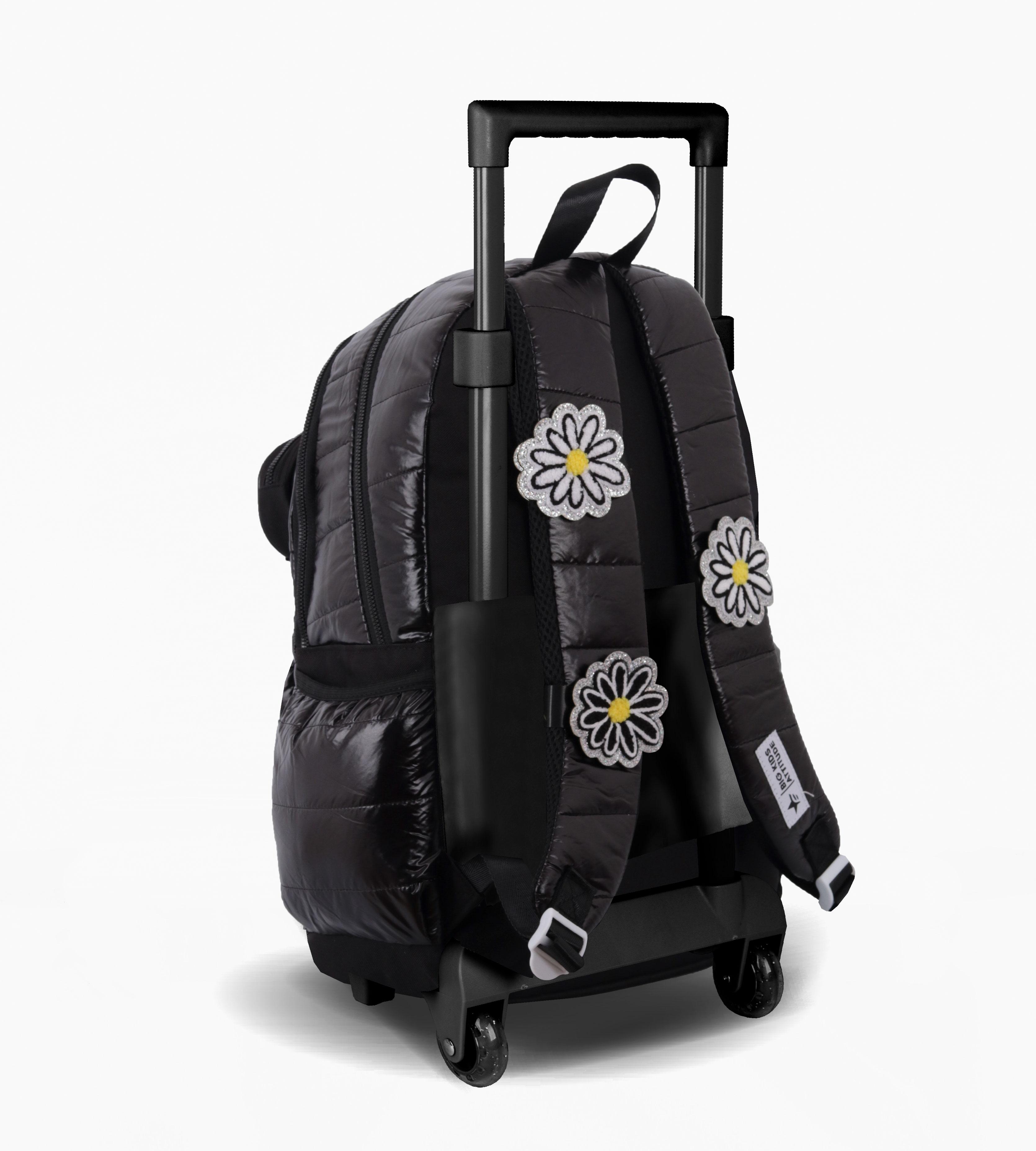 Descripción: MOCHILA CARRO 18P 2 COMPARTIMENTOS CON CIERRE 1 BOLSILLO FRONTAL 1 BOLSILLO LATERAL BOLSILLO INTERNO PARA NOTEBOOK TELA MATELASEADA CON ESTAMPA LLAVERO DE RUBBER CON FORMA DE MARGARITA Y APLIQUES DE MARGARITA CON VELCRO PARA DECORAR LAS TIRAS. TIRAS REFORZADAS Y MANIJA DE AGARRE.