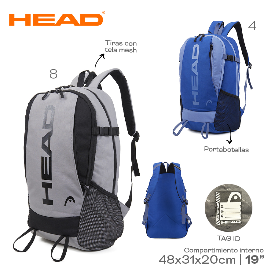 Descripción: Confeccionada en poliéster premium extragrosor impermeable. Íntegramente forrada en tela negra con logo Head. Consta de gran compartimiento principal con súper capacidad, con cierre de doble desplazamiento. Importante bolsillo frontal adosado con cierre. Espaldar y tiras traseras ambos acolchados, estas últimas con mesh airflow antisudor. Bolsillos laterales ideal botella o termo. Tiradores de cierres con lazos deportivos y logo Head. . Frente con marca impresa y placa de goma 3D de la marca. Modelo súper canchero y dúctil.