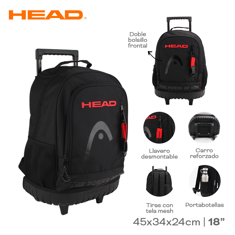 Descripción: La mochila carro escolar Head 18'' es la elección perfecta para los niños que buscan comodidad y estilo en su día a día. Con una capacidad de 30 litros, ofrece amplio espacio para libros, útiles escolares y otros accesorios esenciales. Su diseño reforzado garantiza durabilidad, mientras que su material de poliéster a prueba de agua protege el contenido de la mochila en cualquier clima. Con dimensiones de 45 cm de altura, 34 cm de ancho y 24 cm de profundidad, esta mochila es ideal para el uso escolar diario. Cuenta con cuatro bolsillos, incluyendo un práctico bolsillo para botella, lo que facilita la organización de los objetos personales. Las ruedas permiten un transporte fácil y cómodo, haciendo que el desplazamiento sea sencillo para los más pequeños.