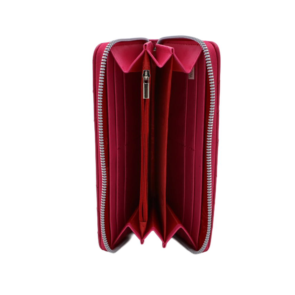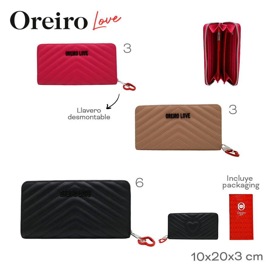 Descripción: Billetera Oreiro Love 28301. -Material: 100% PU. -Medidas: 10 cm Alto x 20 cm Ancho x 3 cm Profundidad. -Contiene: Un bolsillo principal de cierre con cinco compartimientos organizadores, ocho compartimientos para tarjetas y uno para billetes. -Incluye Packaging y un llavero.