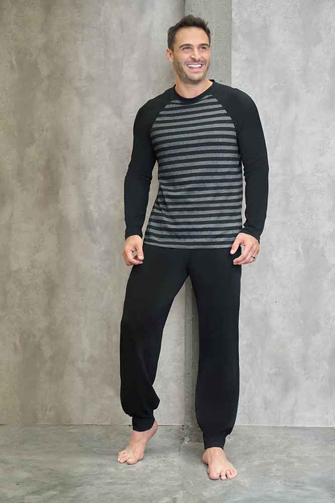 Descripción: Pijama MANGA LARGA marca LENCATEX. Modelo con remera manga larga rayada y puño en manga, pantalon largo liso con puño sin bolsillos, ambas prendas son de algodon.