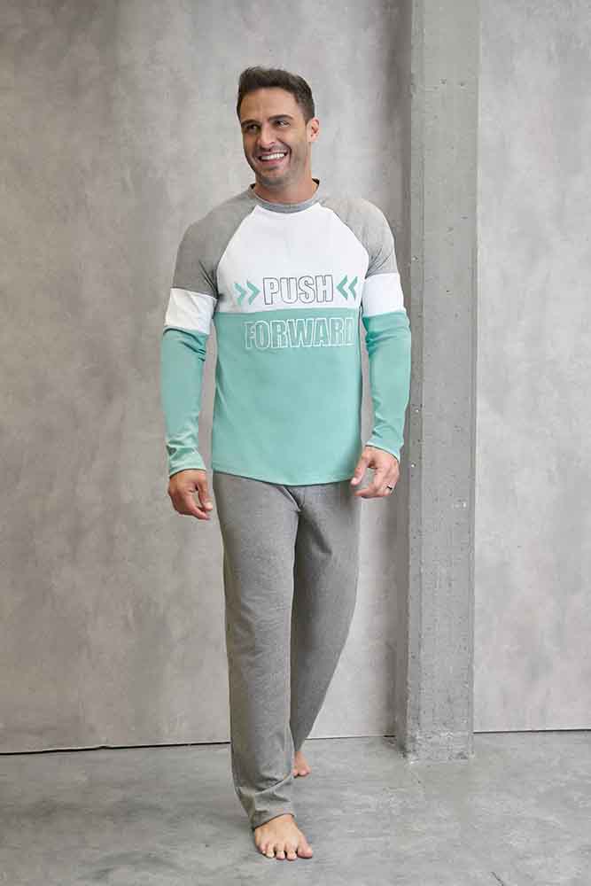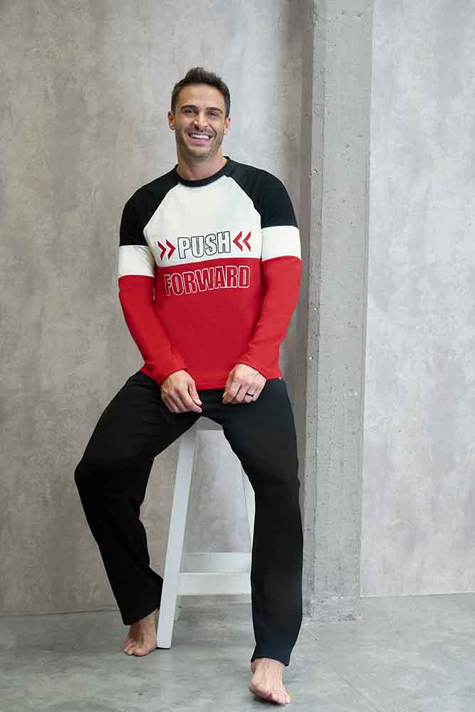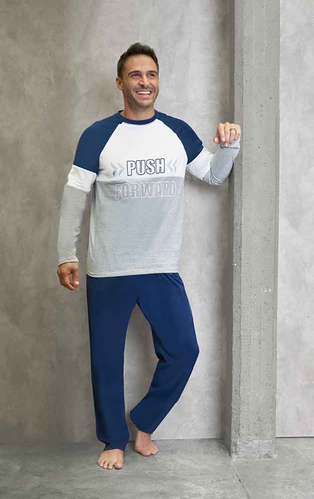 Descripción: Remera manga larga lisa combinada. Pantalón largo con puño y cintura elastizada. Pijama de corte amplio confeccionado en jersey algodón, diseño combinado. Talles: XXL - XXXL Colores: Rojo - Verde - Gris. Composición: 100% algodón.