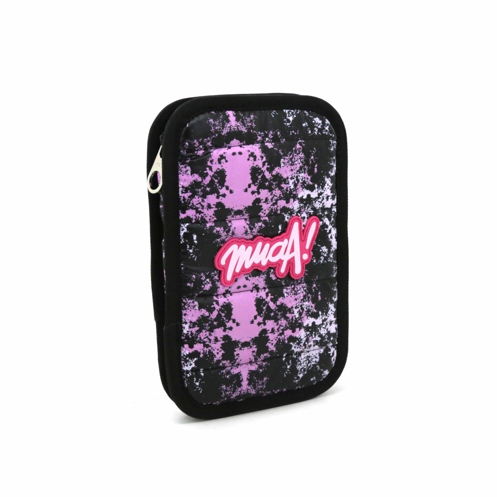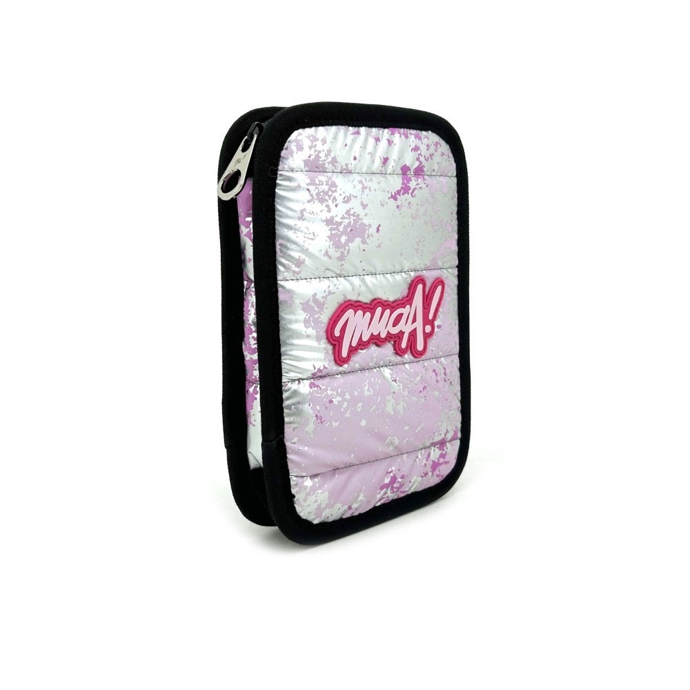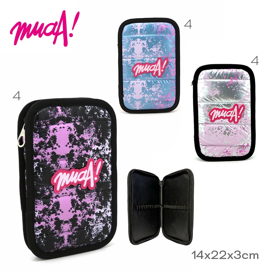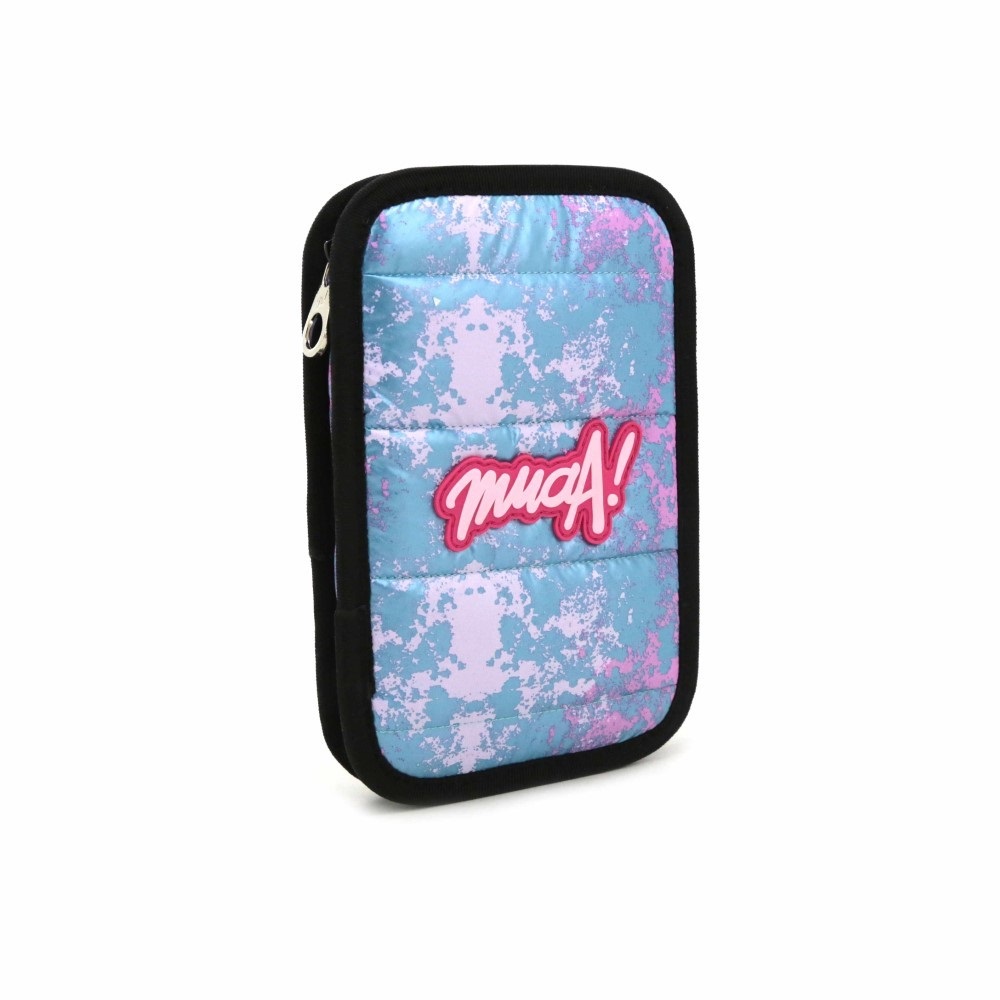 Descripción: Cartuchera Muaa 17611 Color: Negro, plateado y aqua. Medidas: 22 cm de alto x 14 cm de ancho x 3 cm de profundidad. Material: 100% Poliester.
