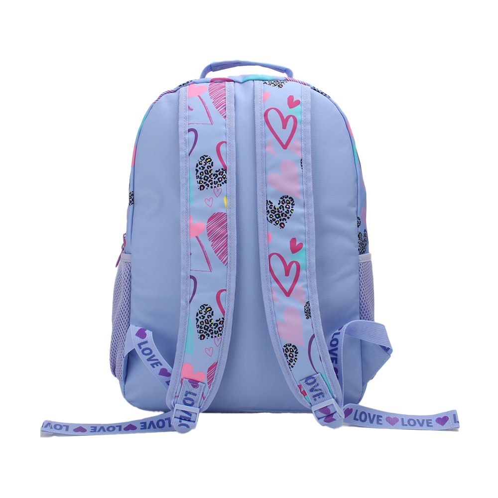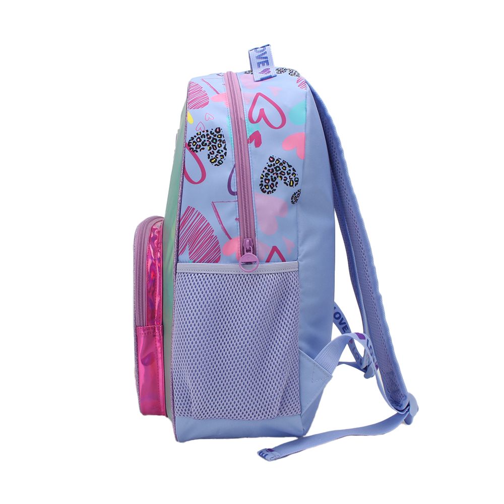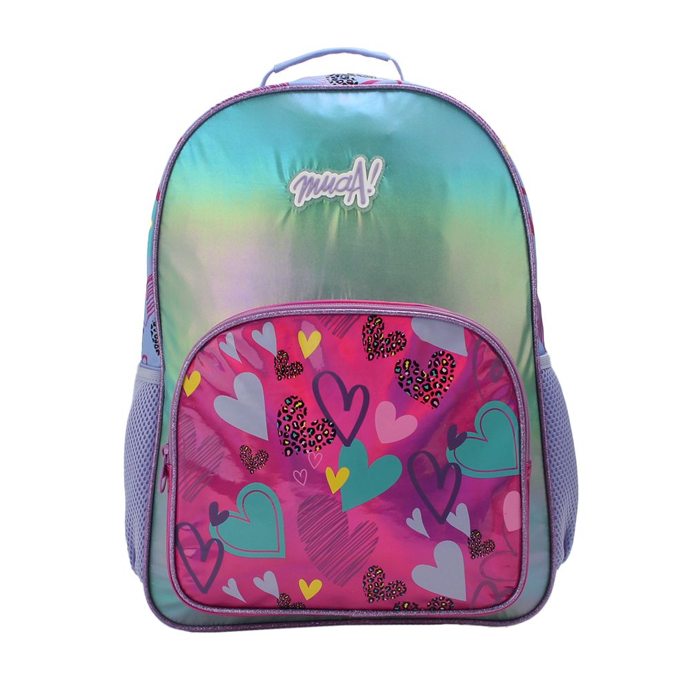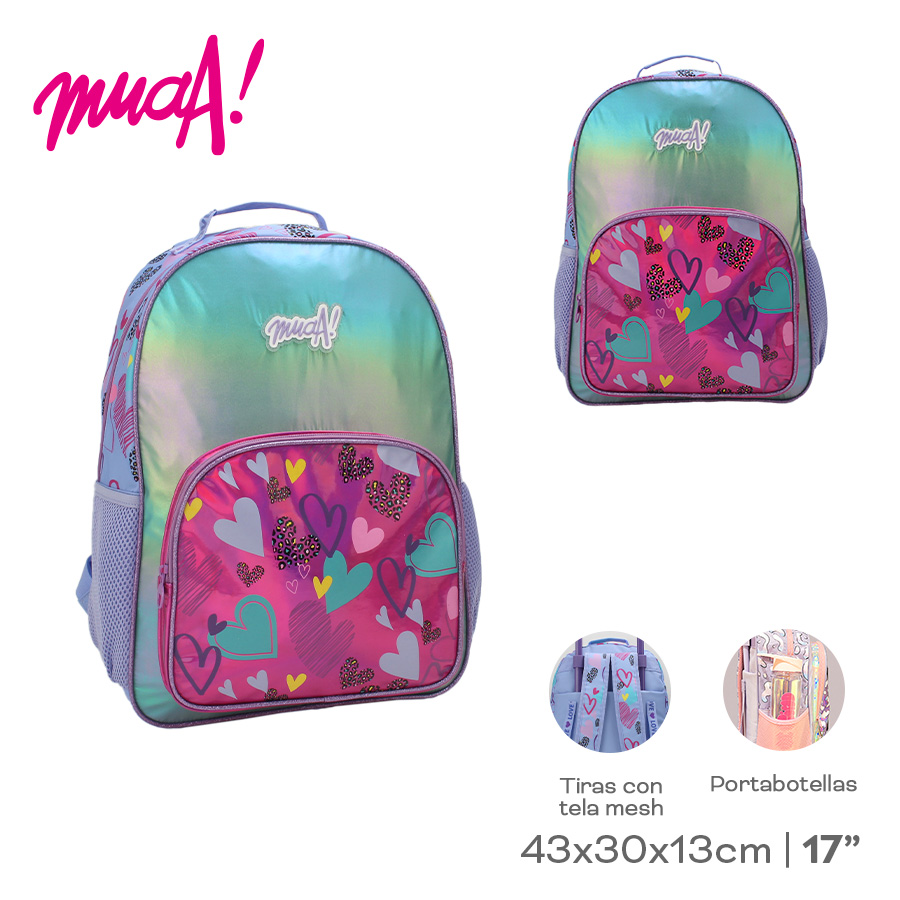 Descripción: "Mochila Muaa 28053. Material: 90% Poliester + 10% PVC. *Un asa de transporte. *Un bolsillo frontal. *Forrada en la parte interna. *dos bolsillos laterales de red. *Tiras de espalda acolchadas. *Tela metalizada.