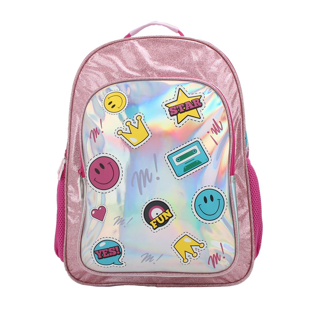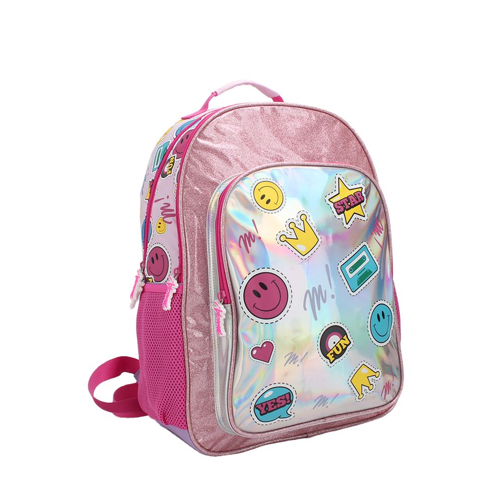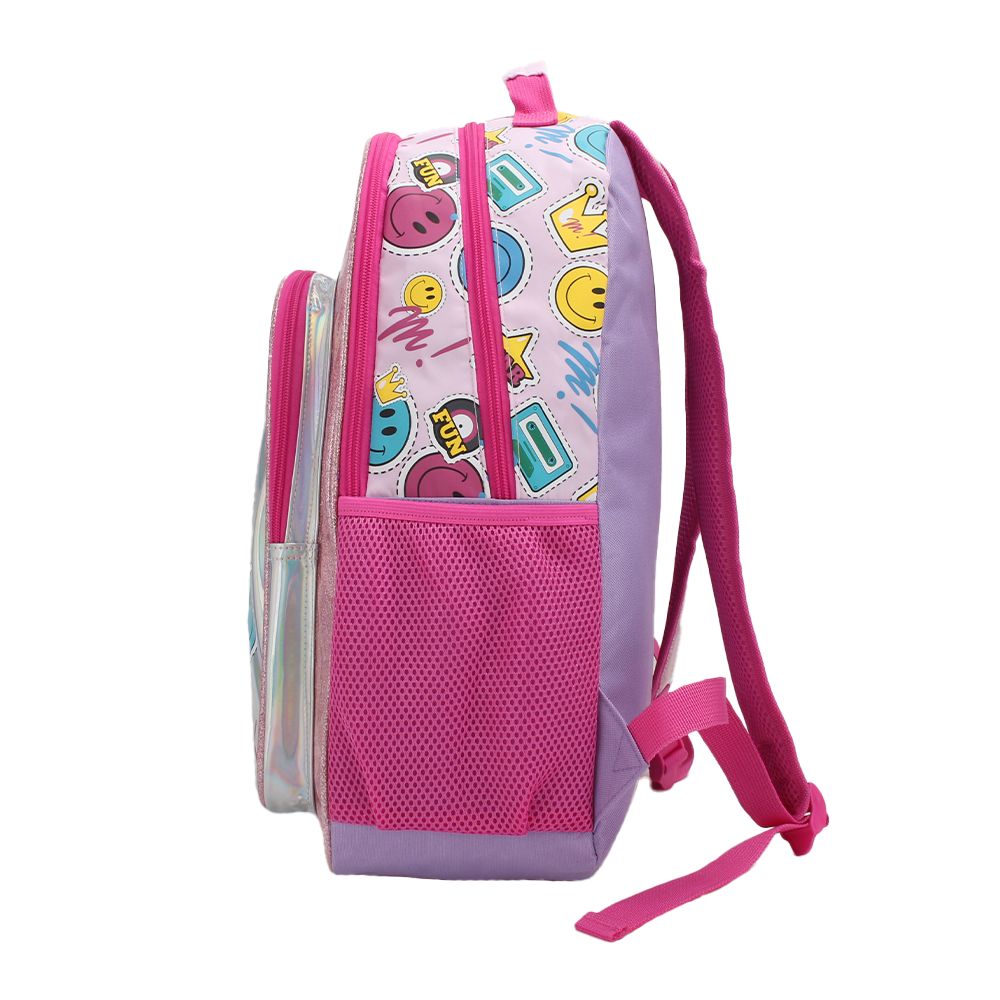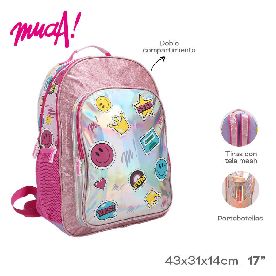 Descripción: · Doble compartimiento principal. · Confeccionada en 80% Poliester + 20% PVC. · Bolsillo frontal con cierre. Mochila Escolar Muaa! - Amplio compartimiento Principal - Bolsillo frontal - Modelo Ultra Liviano y fácil de transportar ¡Ideal para tu día a día, viajes y paseos! Lleva tus cosas protegidas ¡La mochila más Segura! Diseño que atraviesa temporadas y con la mejor onda ¡Lleva todo en ella y tené tus manos libres! · Mochila Escolar Muaa. · Dos bolsillos laterales porta botella. · Doble compartimiento amplio. · Tiras ajustables y acolchadas Air Mesh. · Asa superior de transporte. · Interior forrado. · Diseño estampado con emojis. · Cierres reforzados. · Zippers metálicos. · Tamaño 17". · Ideal para tu día a día, viajes y paseos. · Medidas: Alto 43cm x Ancho 31cm x Prof.14cm.