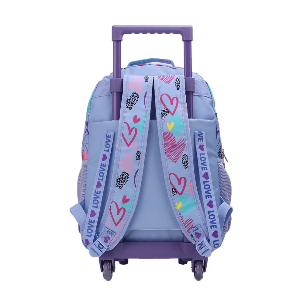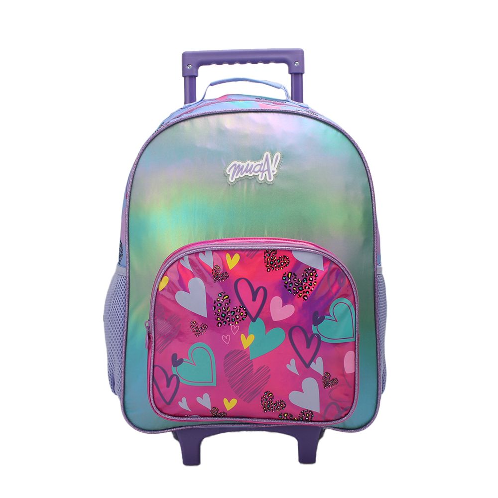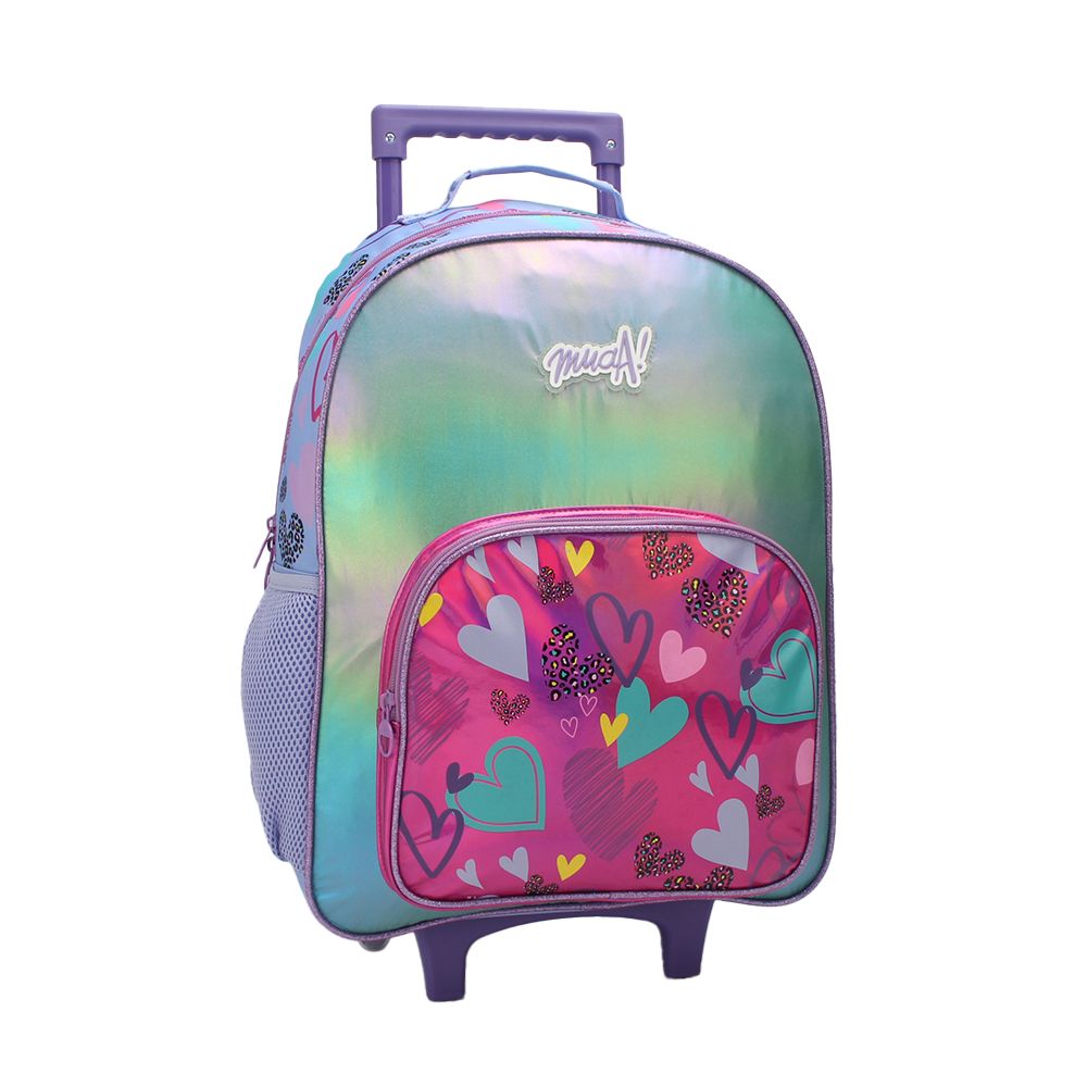 Descripción: · Confeccionada en PVC y Poliéster. · Amplio compartimiento principal. · Ruedas de silicona reforzadas. Diseño confeccionado en materiales de primera calidad. Modelo Ultra Liviano y fácil de transportar - Tiras acolchadas para el cuidado los hombros - Confeccionado en Tela reforzada Anti Desgarre ¡Ideal para la escuela, viajes o paseos! Lleva tus cosas protegidas ¡La mochila Carro más Cómoda! · Mochila con carro extensible. · Tela Iridiscente. · Bolsillo frontal con cierre. · Dos bolsillos laterales de red porta botella. · Material reforzado anti desgarre. · Tiras de espalda acolchadas Air Mesh. · Asa superior reforzada. · Diseño estampado frontal. · Manija regulable en altura para usar como carro. · Base rígida reforzada. · Logo frontal Muaa. · Interior forrado. · Tamaño 18" . · Medidas: Alto 45cm x Ancho 26cm x Prof. 17cm