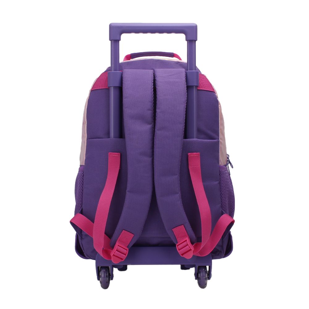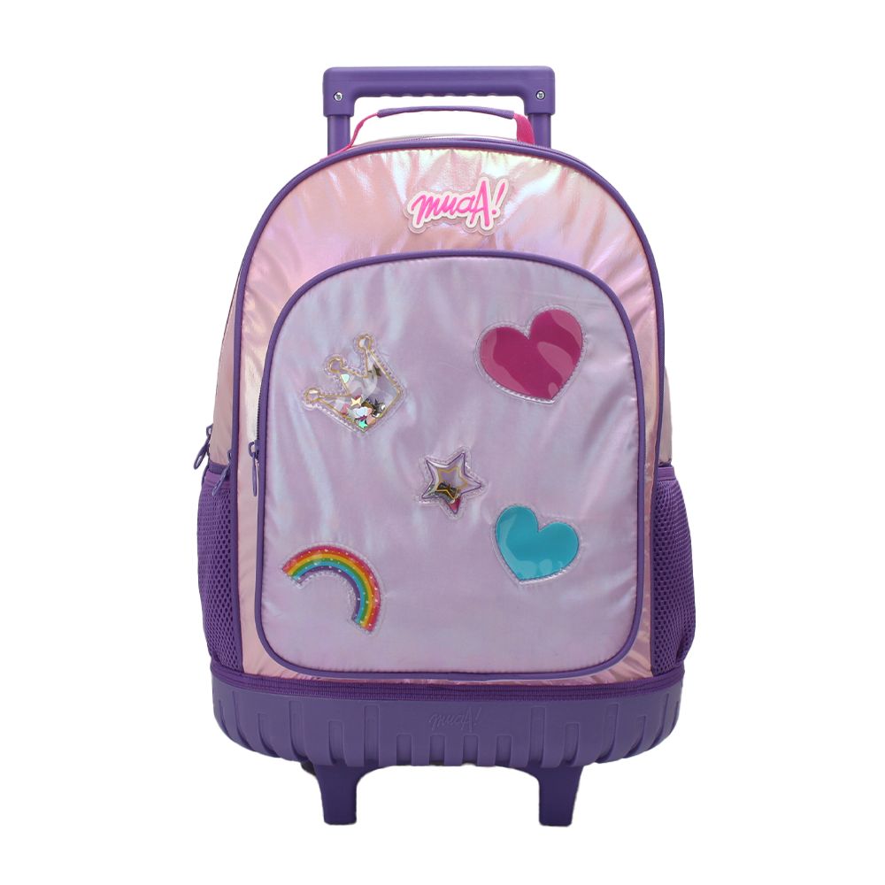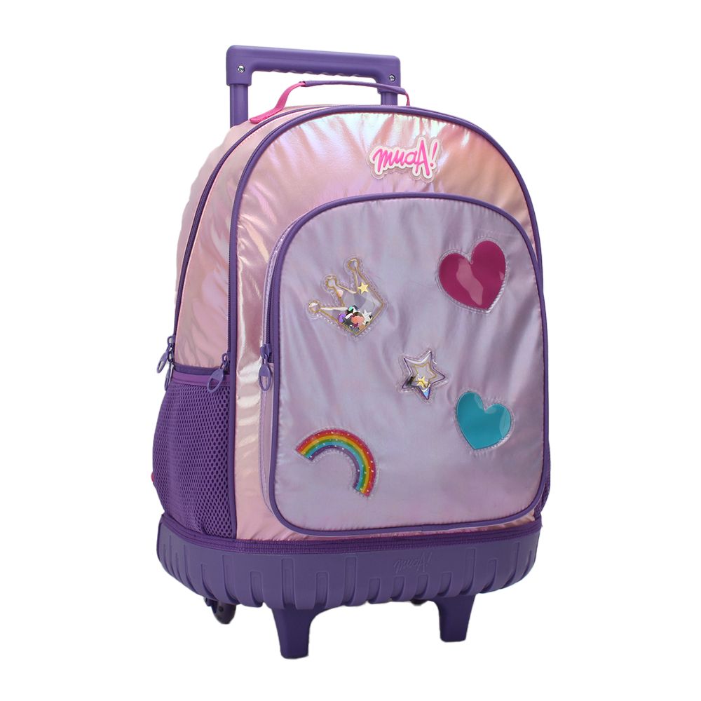 Descripción: · Confeccionada en PVC y Poliéster. · Amplio compartimiento principal. · Ruedas de silicona reforzadas. Diseño confeccionado en materiales de primera calidad. Modelo Ultra Liviano y fácil de transportar - Tiras acolchadas para el cuidado los hombros - Confeccionado en Tela reforzada Anti Desgarre ¡Ideal para la escuela, viajes o paseos! Lleva tus cosas protegidas ¡La mochila Carro más Cómoda! · Mochila con carro extensible. · Tela Iridiscente. · Bolsillo frontal con cierre. · Dos bolsillos laterales de red porta botella. · Material reforzado anti desgarre. · Tiras de espalda acolchadas Air Mesh. · Asa superior reforzada. · Diseño estampado frontal. · Manija regulable en altura para usar como carro. · Base rígida reforzada. · Logo Frontal Muaa. · Interior forrado. · Tamaño 18". · Medidas: Alto 45cm x Ancho 34cm x Prof. 23cm.