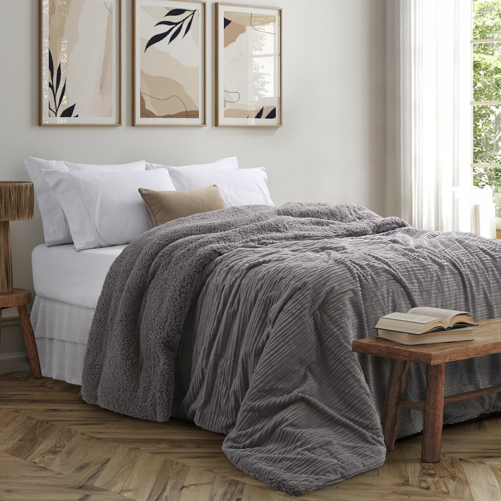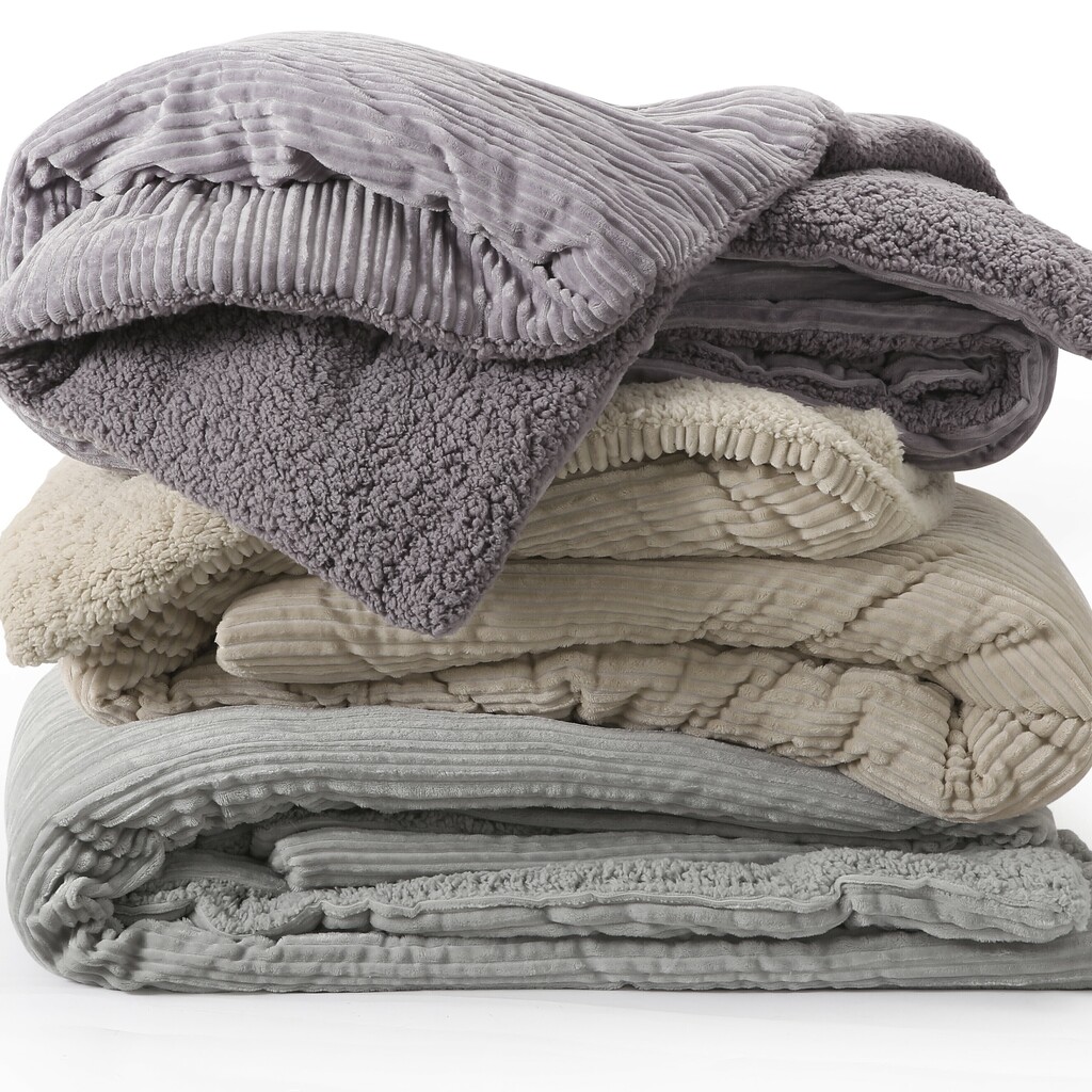Descripción: Edredón de microflannel jacquard con diseño de rayas horizontales y reverso de corderito. 240 X 240 cm