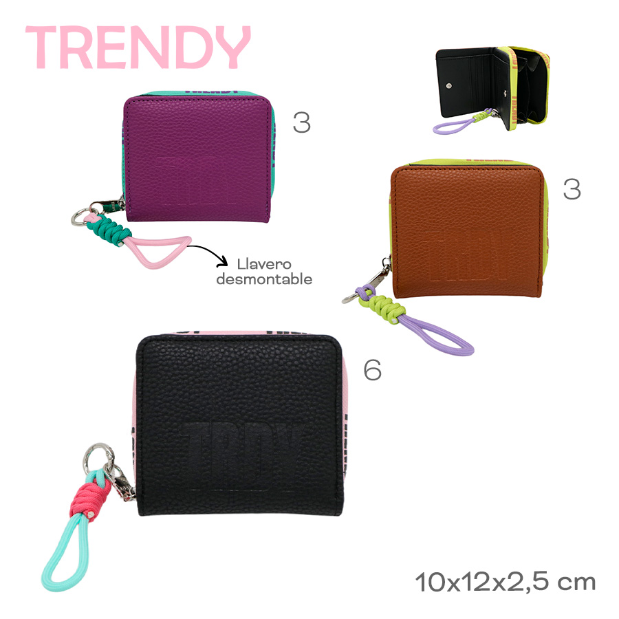 Descripción: Billetera Trendy 28348. -Material: 100% PU. -Medidas: 10 cm Alto x 12 cm Ancho x 2.5 cm Profundidad. -Contiene: Un bolsillo principal de cierre con dos compartimientos organizadores, ocho compartimientos para tarjetas y uno para billetes. -Incluye un llavero.