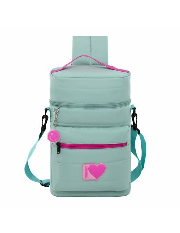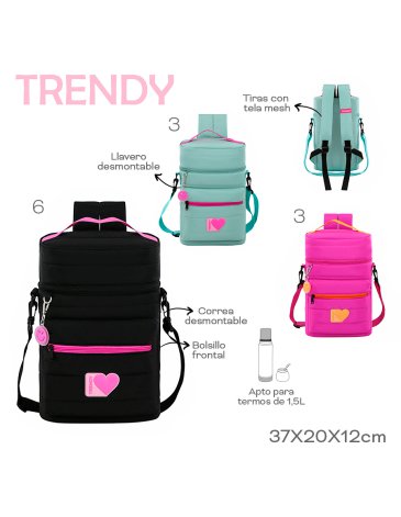 Descripción: Bolsillo frontal, correa desmontable, llavero desmontable, tiras con tela mesh, cap. termos 1,5L 37 cm x 20 cm x 12 cm