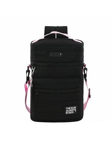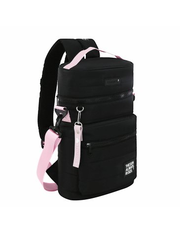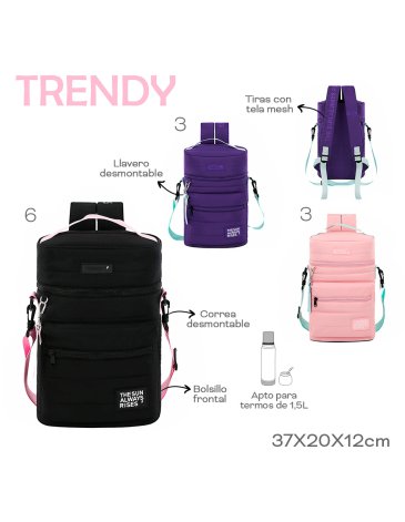 Descripción: Bolsillo frontal, correa desmontable, llavero desmontable, tiras con tela mesh, cap. termos 1,5L 37 cm x 20cm x 12cm
