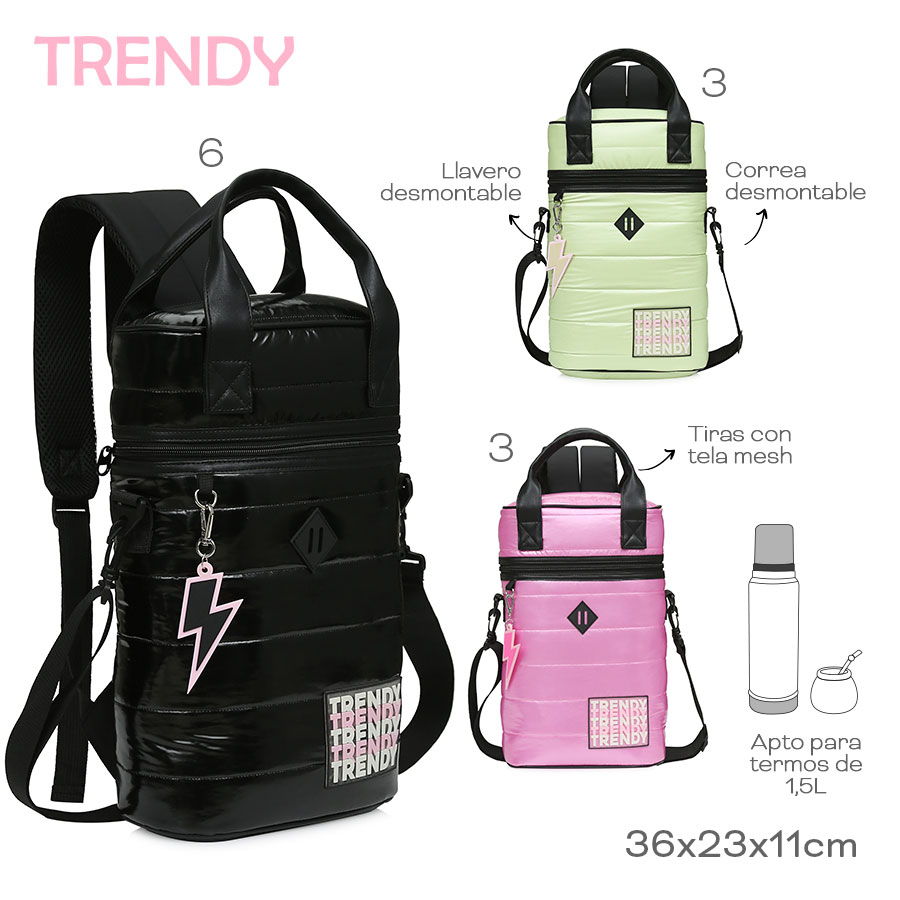 Descripción: Se puede usar como Mochila o Bolso. Lleva tu Set matero con Estilo y Protegido. Con cierre metálico, y detalle de aplique con logo de la marca. Ideal para picnic o salir a tomar mate. Matera Trendy. Correa y llavero desmontable. Tiras con tela mesh. Apto para termos de 1,5 L. 36x23x11 cm.