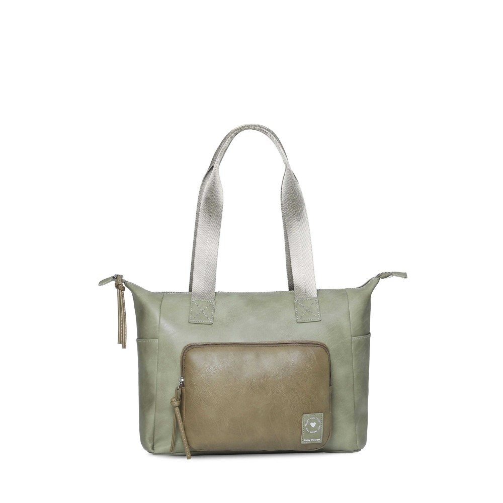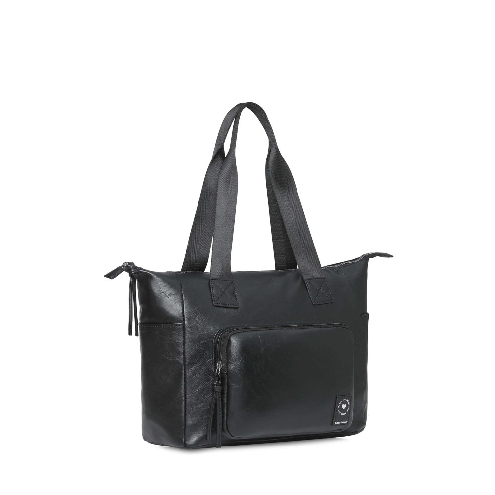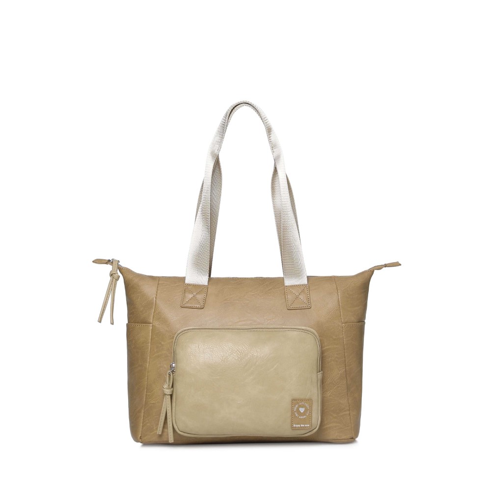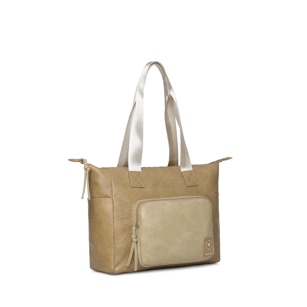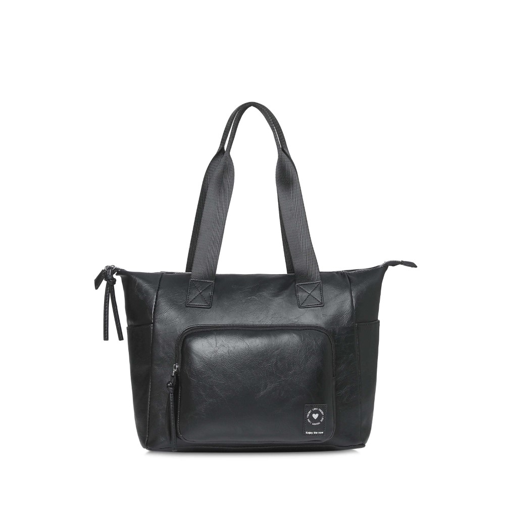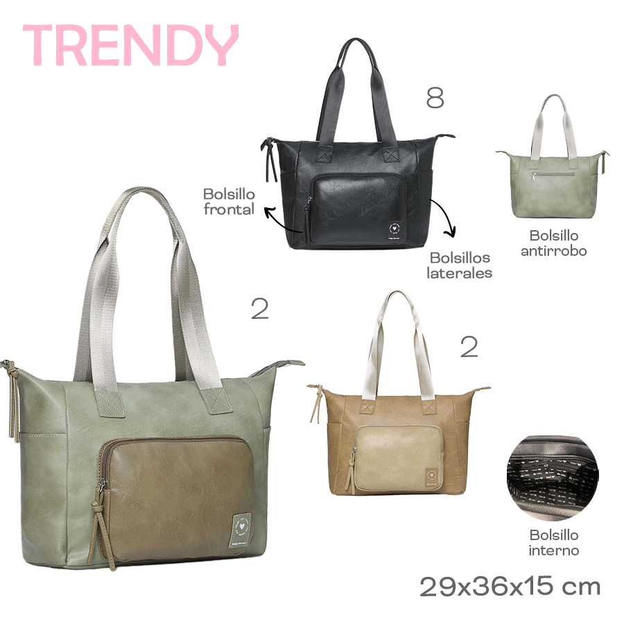 Descripción: CARTERA TOTE TRENDY. Cartera hecha en Cuero Pu. Compartimiento principal con cierre. Dos bolsillos internos. Un bolsillo frontal. Un bolsillo posterior antirrobo. Dos bolsillos laterales. Forrada en su interior con el logo de la marca. Dos asas de transporte. Correa ajustable y extraíble de hasta 135 cm. Detalle de la marca en el frente. Dimensiones: 29 x 36 x 15 cm. Material: 100% Cuero Pu.