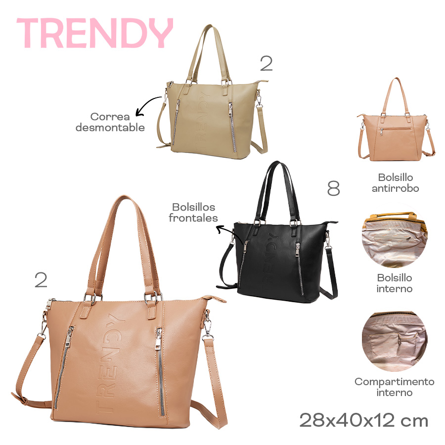 Descripción: Presentamos la Cartera Trendy ECO Cuero, el accesorio ideal para la mujer moderna que busca estilo y funcionalidad en un solo producto. Fabricada con eco cuero de alta calidad, esta cartera no solo destaca por su diseño elegante, sino también por su compromiso con el medio ambiente. Sus asas a tono complementan el look, mientras que su cierre seguro y mecanismo antirrobo garantizan la protección de tus pertenencias. El interior de la cartera está forrado con tela, ofreciendo un acabado sofisticado y cómodo. Cuenta con un práctico bolsillo interno con cierre, perfecto para organizar objetos pequeños y tener siempre a mano lo que necesitas. Además, su correa regulable permite ajustarla a tu comodidad, brindándote versatilidad en su uso diario. El logo de la marca Trendy se refleja en cada detalle, asegurando que lleves contigo un símbolo de calidad y estilo. Esta cartera, a pesar de no ser reversible, se adapta a diversas ocasiones, desde un día de trabajo hasta una salida casual. Atrévete a complementar tu atuendo con la Cartera Trendy ECO Cuero y disfruta de un accesorio que combina diseño y practicidad.