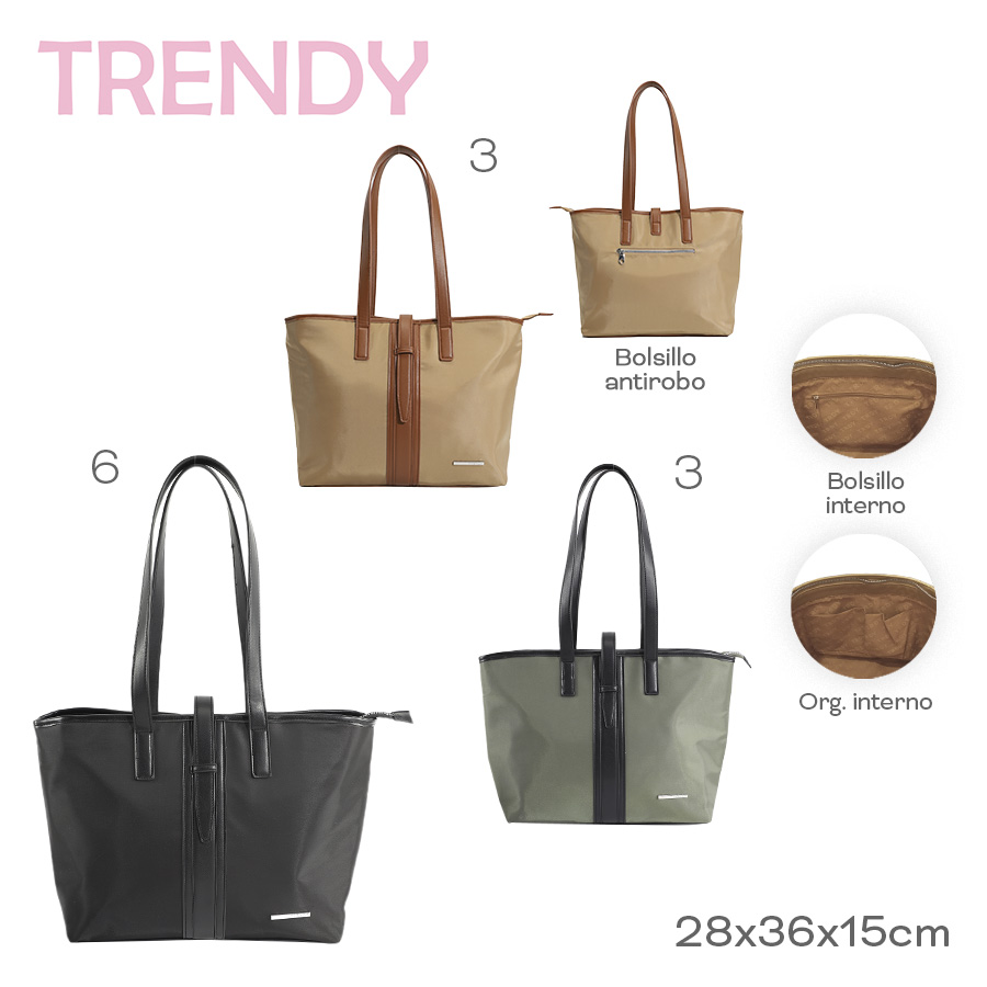 Descripción: CARTERA TOTE ANTIRROBO MUJER TRENDY ECO CUERO. · Amplio compartimiento principal. · Confeccionada en Poliéster y Eco Cuero. · Bolsillo posterior antirrobo. · Organizadores internos. Cartera de Mujer Trendy - Amplio compartimiento Principal - Interior forrado - Cierre Reforzado ¡Lleva todas tus cosas protegidas! La más Segura, Ultra Liviana y Resistente - Diseño cómodo y a la moda, elegante ideal para tus salidas o paseos. · Cartera Tote Mujer Trendy. · Material resistente anti desgarre. · Dos asas superiores de transporte ajustables. · Cierres reforzados. · Zippers metálicos. · Interior forrado con logo de la marca. · Resistente y liviana. · Ideal para su uso diario. · Lleva todas tus cosas protegidas. · Medidas: Alto 28cm x Ancho 36cm x Prof. 15cm.