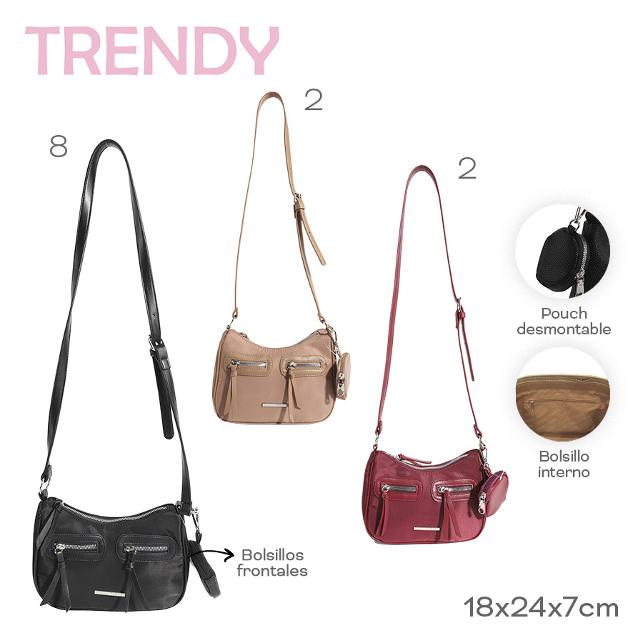 Descripción: · Amplia división principal con cierre. · Correa de hombro ajustable hasta 113cm. · Incluye monedero desmontable. Morral Mujer Trendy - Amplio compartimiento Principal - Interior forrado - Cierre metálico Reforzado ¡Lleva todas tus cosas protegidas! La más segura, ultra liviana y resistente - Diseño cómodo y a la moda, ideal para tus salidas o paseos. · Confeccionada en Poliéster. · Dos bolsillos frontales con cierre. · Bolsillo interno con cierre. · Tela reforzada anti desgarre. · Cierres reforzados. · Interior forrado con logo de la marca. · Tiradores exclusivos. · Resistente y liviana. · Medida: Alto 18cm x Ancho 24cm x Prof. 7cm.
