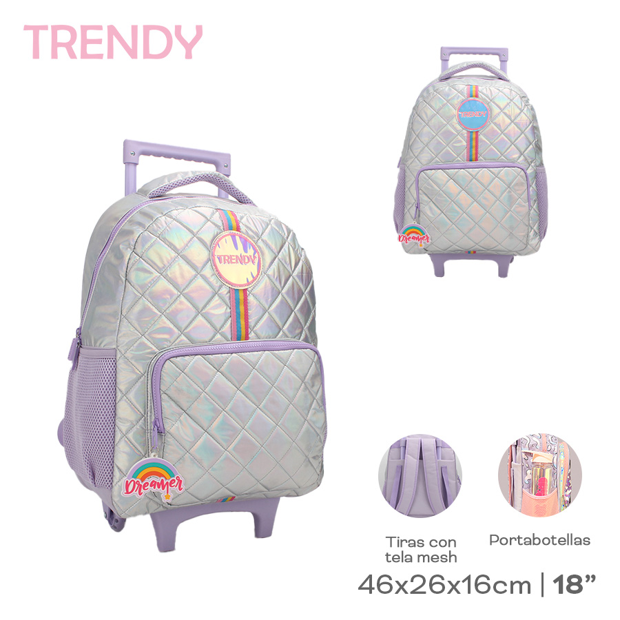 Descripción: Mochila Carro Trendy Dreamer 18 PuLG Escolar Infantil Niña. La mochila con carrito Trendy de 18 pulgadas combina funcionalidad y estilo en un diseño único y moderno. Su exterior con acabado iridiscente acolchado y detalles en colores vibrantes, como la cinta decorativa y el llavero de arcoíris "Dreamer", la convierten en la elección perfecta para niñas y jóvenes que buscan destacar. Equipada con doble compartimento principal con cierre, permite organizar útiles escolares, carpetas y libros de manera eficiente. Sus bolsillos laterales de malla son ideales para botellas o pequeños objetos de acceso rápido. Además, las tiras acolchadas y ajustables con tela mesh garantizan comodidad si se desea llevar como mochila. Gracias a su manija retráctil y ruedas reforzadas, ofrece un transporte práctico y sin esfuerzo, ideal para largas jornadas escolares. La base rígida y robusta brinda estabilidad y durabilidad, protegiendo el contenido en todo momento. Dimensiones: 46x26x16 cm. Material resistente y de alta calidad, diseñado para un uso diario intensivo.