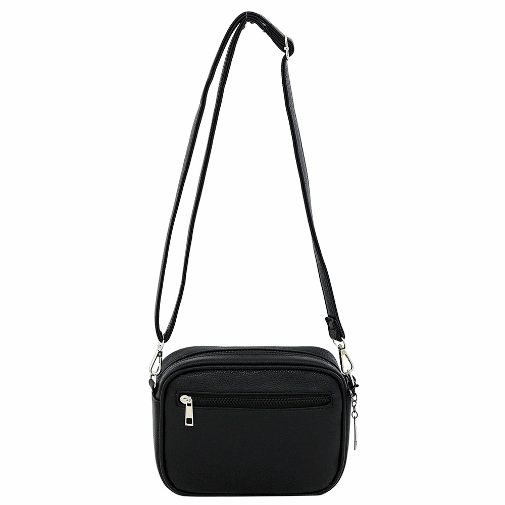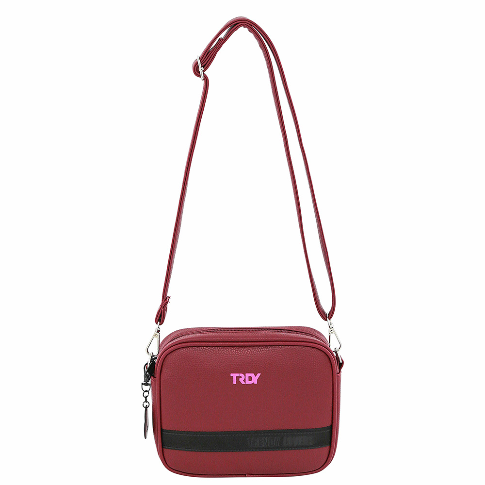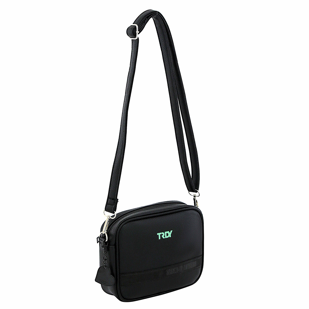 Descripción: Medidas: 16 cm Alto x 20,5 cm Ancho x 5 cm Profundidad. Material: 100% PU. Contiene: Un bolsillo principal, un bolsillo posterior, tira de transporte ajustable. Incluye un llavero.