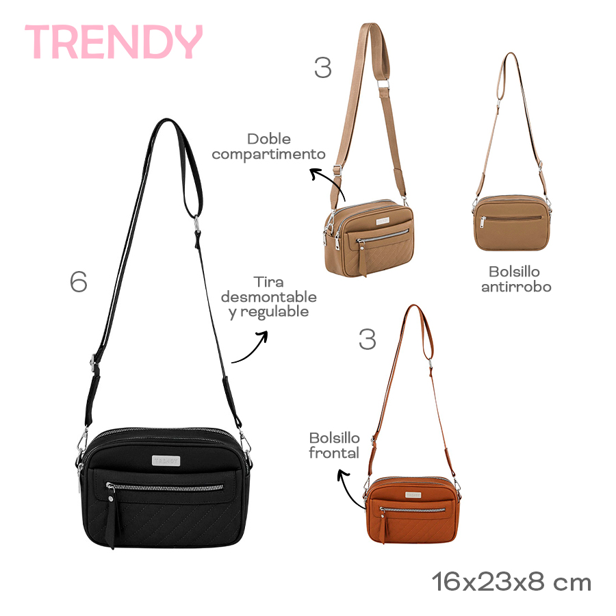 Descripción: Tira desmont y regulable,doble compartimento, bolsillo antirrobo y frontal