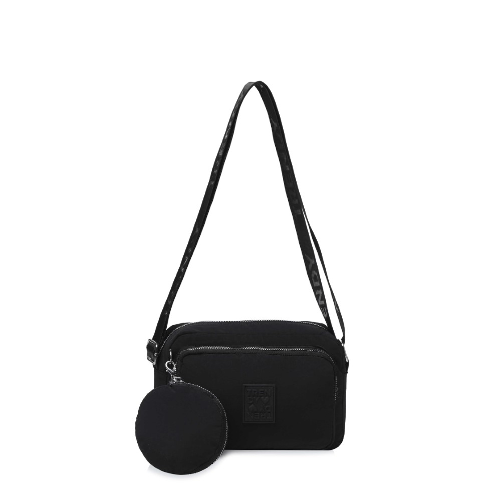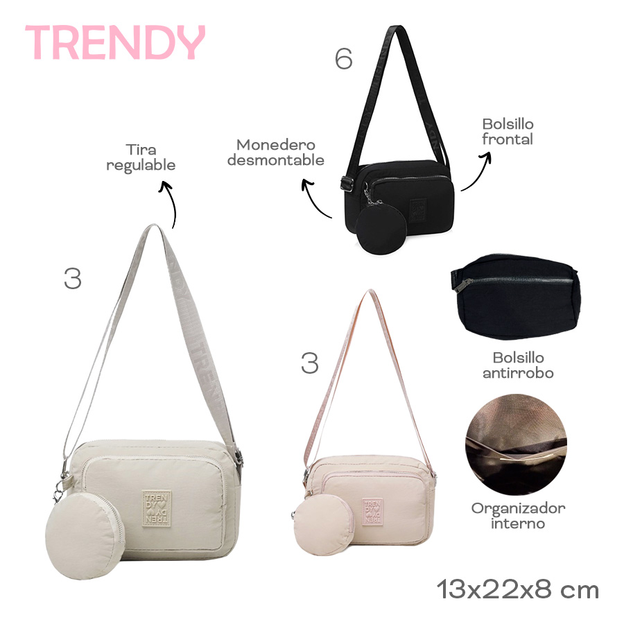 Descripción: Morral con Monedero Trendy 18834. -Material: 100% Nylon. -Medidas: 13 cm alto x 22 cm ancho x 8 cm profunduidad. -Contiene: Un bolsillo frontal, un bolsillo principal con un bolsillo interno organizador, un bolsillo posterior, tira de trasporte ajustable. -Incluye un monedero (10cm diametro).