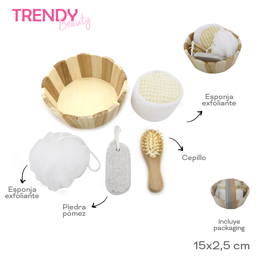 Descripción: Esponja exfoliante: Fabricada en sisal y poliéster, textura resistente para eliminar células muertas sin irritar la piel.