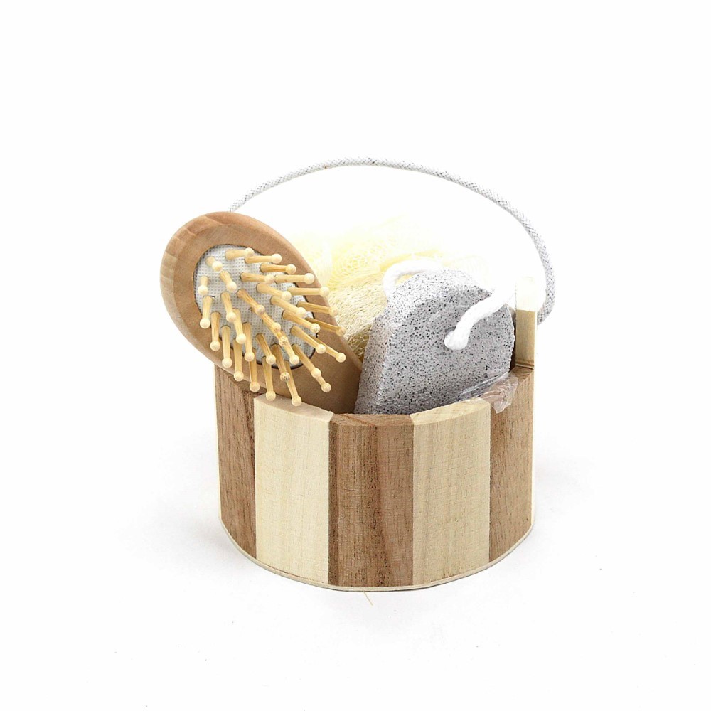 Descripción: Set baño Trendy. Info: Esponja vegetal, esponja exfoliante, cepillo, piedra pómez. Incluye packagin.