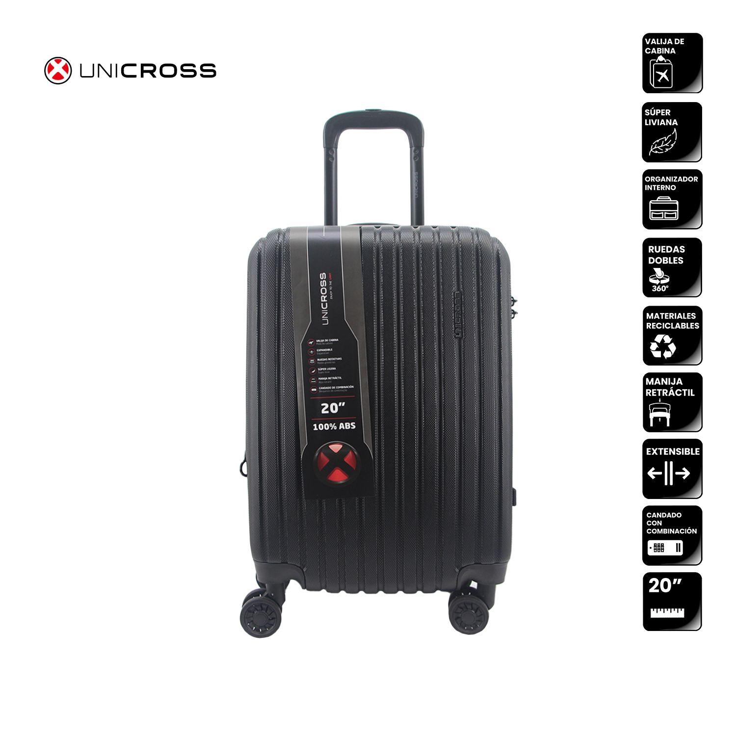 Descripción: VALIJA CARRY ON REFORZDA CON RUEDAS RIGIDA LIVIANA DE ABS. * [Incluye candado]: A diferencia de otras valijas, nuestra valija viene con candado incluido para que no tengas que salir a comprarlo por tu cuenta. * [Es expandible]: Si te quedaste sin espacio, podés activar el fuelle de expansión y expandir el volumen de 34 Litros a 42 Litros. * [Ideal para cabina]: Nuestra maleta respeta las medidas máximas permitidas para el equipaje de mano. * [4 ruedas reforzadas, giratorias en 360 grados y desmontables]: Cuenta con 4 ruedas giratorias en 360 grados para un fácil manejo. Son también reforzadas para una larga duración. ¡Las mismas son también desmontables para que tu valija ocupe menos espacio mientras está esperando el próximo viaje! * [Alta resistencia a impactos]: La valija está fabricada con ABS, un plástico altamente resistente a impactos y de extendido uso en la industria automotriz (por ejemplo, en la cobertura de las puertas de los autos). Valija Unicross de 20" con 4 ruedas reforzadas y desmontables. Cuenta con un compartimiento principal forrado de gran capacidad. Dicho compartimento es divisible: de un lado, la ropa queda sostenida con elásticos sujetadores especialmente diseñados y, del otro, cuenta con un bolsillo amplio con cierre y diversos bolsillos internos más pequeños para una mayor organización. Cuenta además con fuelle expansible (la profundidad varía de 20 a 25cm). Su manija es reforzada, retráctil y regulable en altura. Medidas: 50 cm alto sin ruedas (55 cm alto con ruedas) / 34 cm ancho / 20 cm profundidad sin expandir (25cm expandida) Peso aproximado: 3 kgs