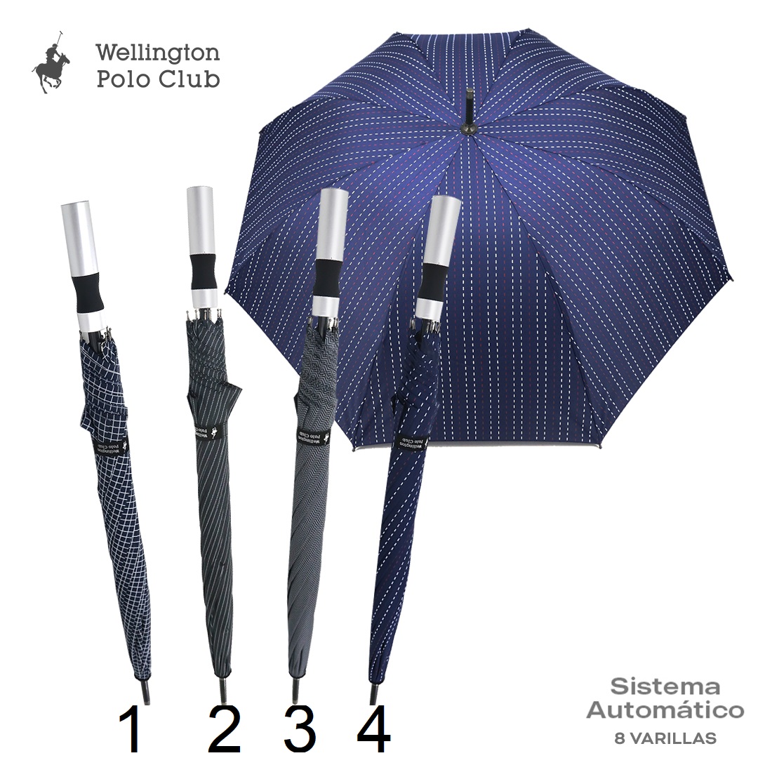 Descripción: Paraguas automático Largo de Hombre Wellington Polo Club, confeccionado en 100% Poliester, largo 86 cm cerrado, super elegante, de 8 varillas, reforzado, con extra resistencia contra el viento. Diámetro aproximado: 122 cm. Material: 100% Poliester.